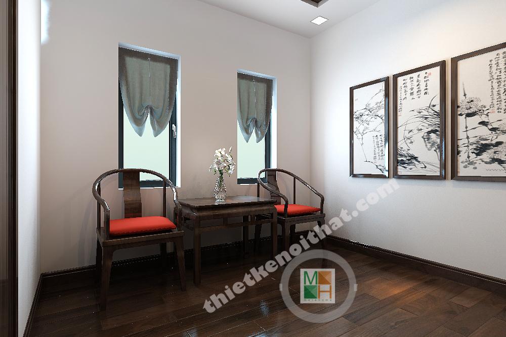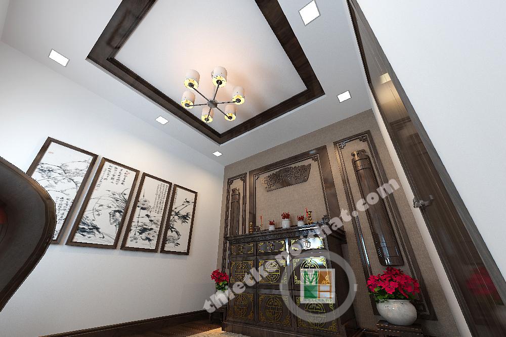 Thiết kế phòng thờ tôn nghiêm với các chi tiết chạm khắc tỉ mỉ mang đậm nét Á đông và thể hiện được lòng thành kính với tổ tiên. Bộ bàn trà hay những bức tranh thêu trên tường cũng góp phần tạo nên sự trang nghiêm và có gì chút gì đó cổ kính.
