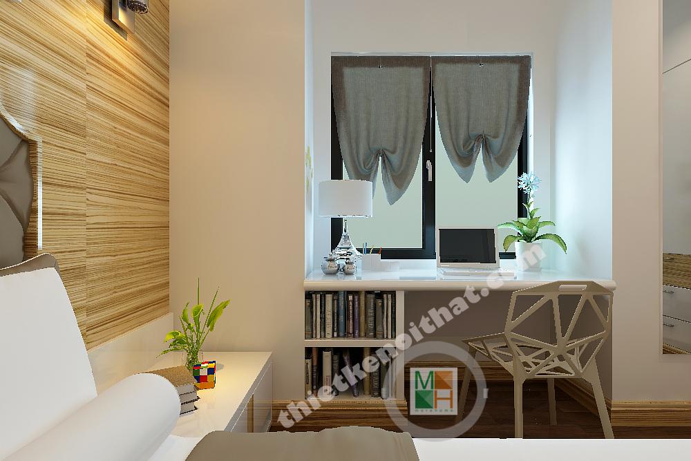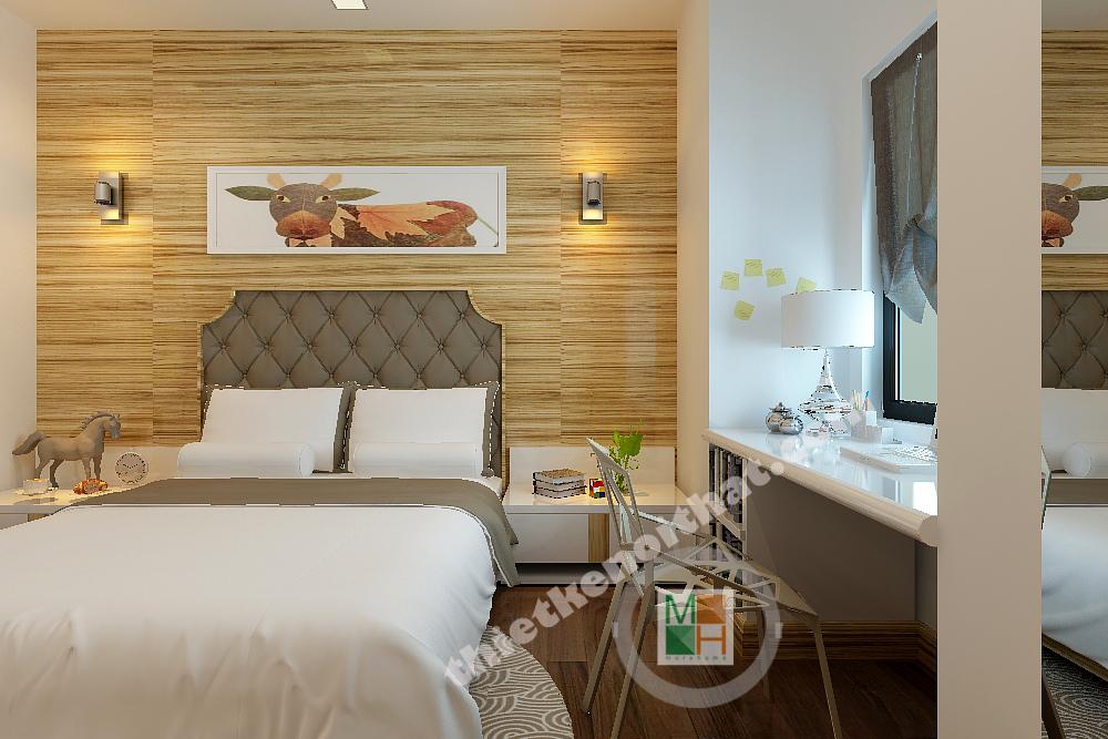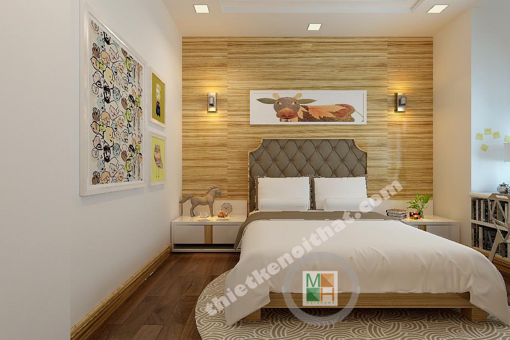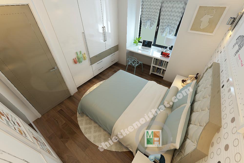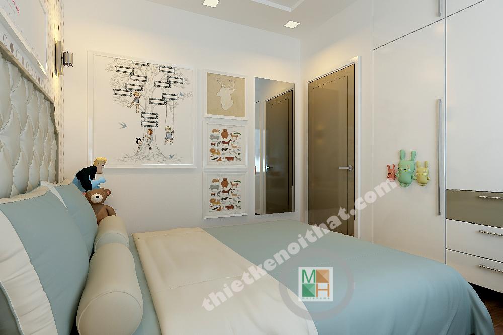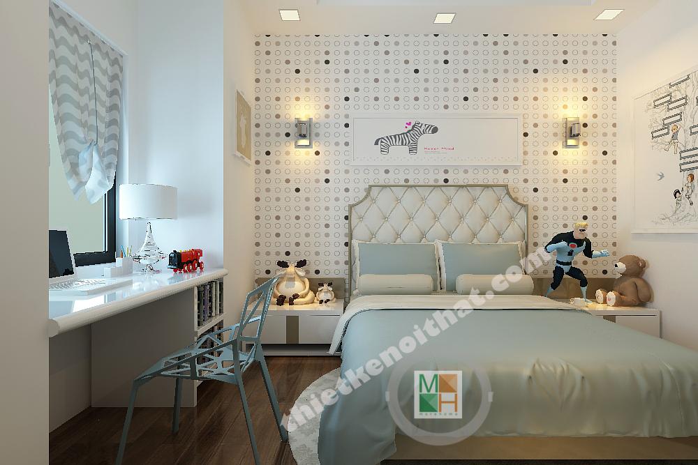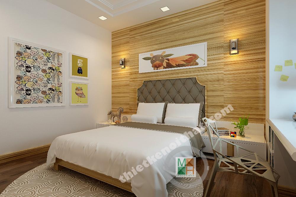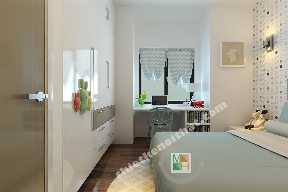 Thiết kế phòng ngủ cho con trai được thiết kế với gam màu sinh động hơn, những bức tranh treo tường màu sắc, tươi vui. Bàn hoc đặt dưới cửa sổ để nhận thêm ánh sáng, tăng độ tập trung cho bé.