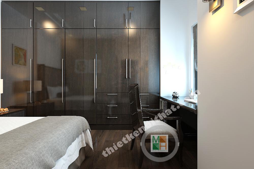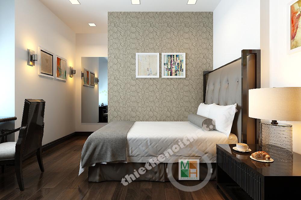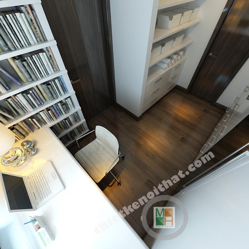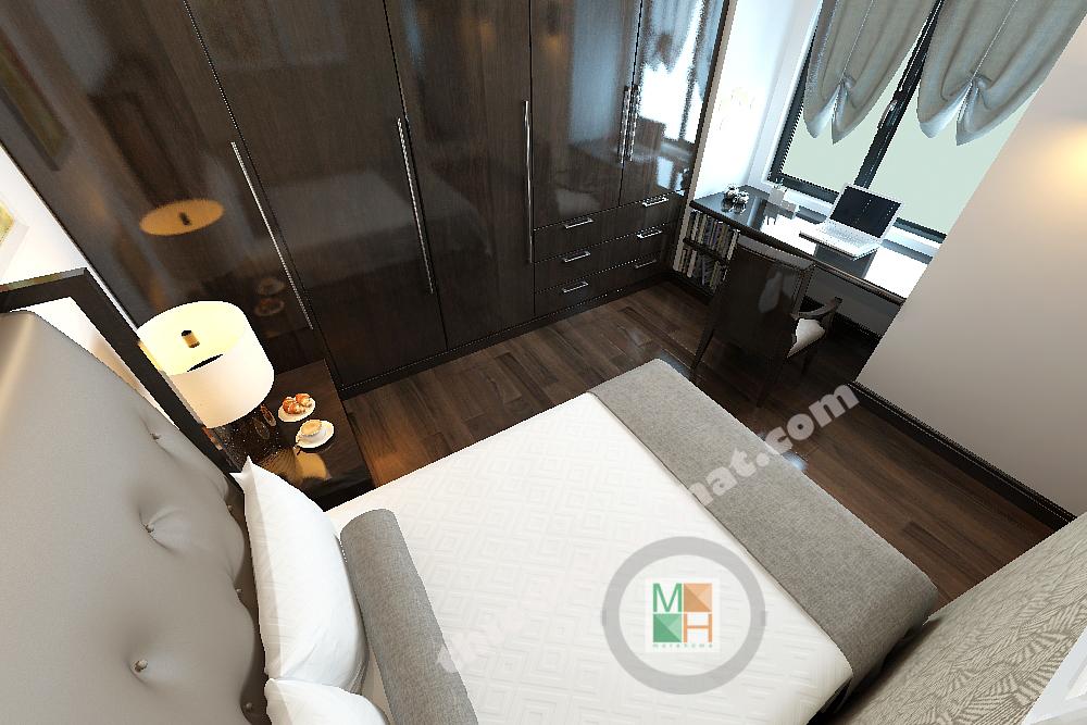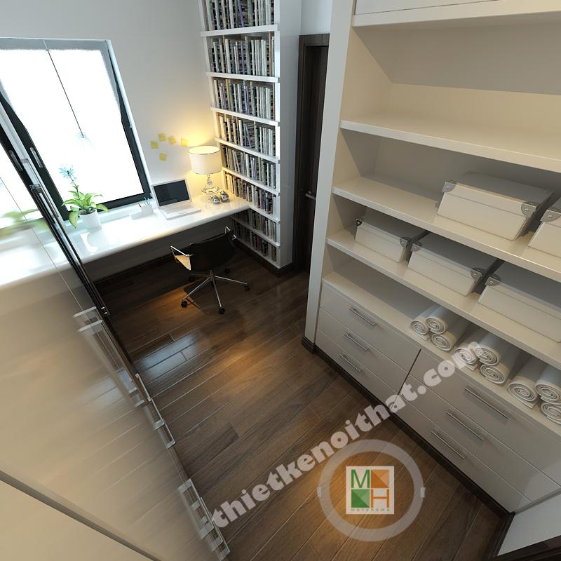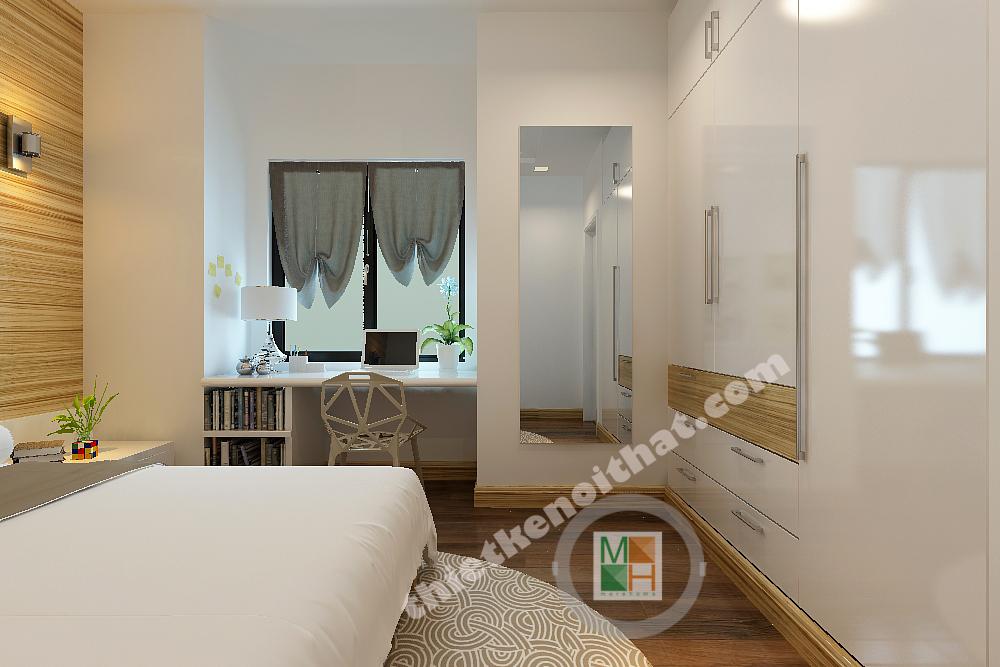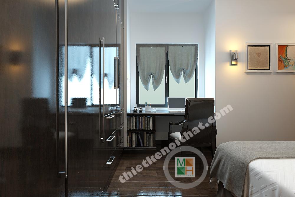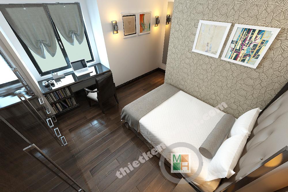Thiết kế phòng ngủ cho con trai được thiết kế với gam màu sinh động hơn, những bức tranh treo tường màu sắc, tươi vui. Bàn hoc đặt dưới cửa sổ để nhận thêm ánh sáng, tăng độ tập trung cho bé.