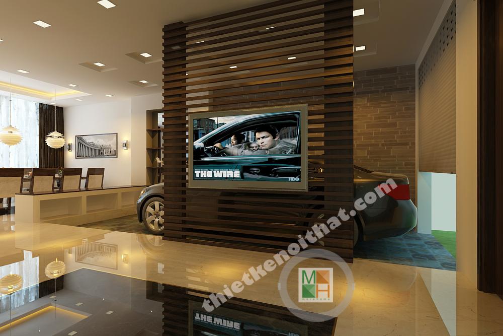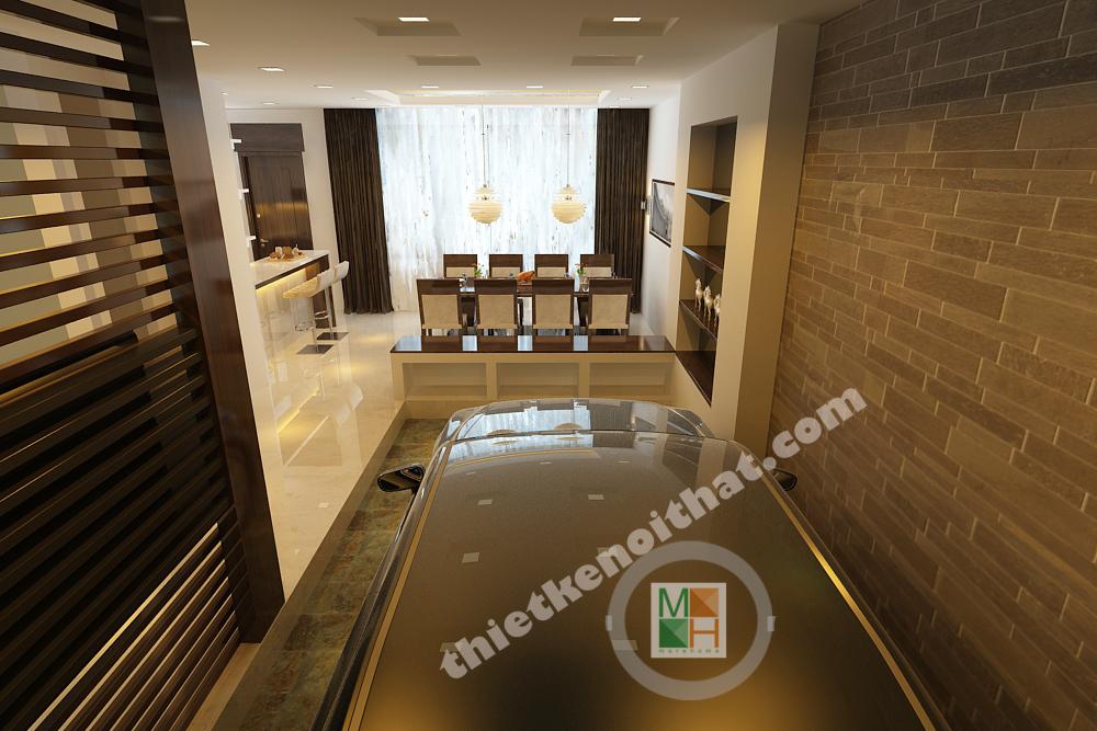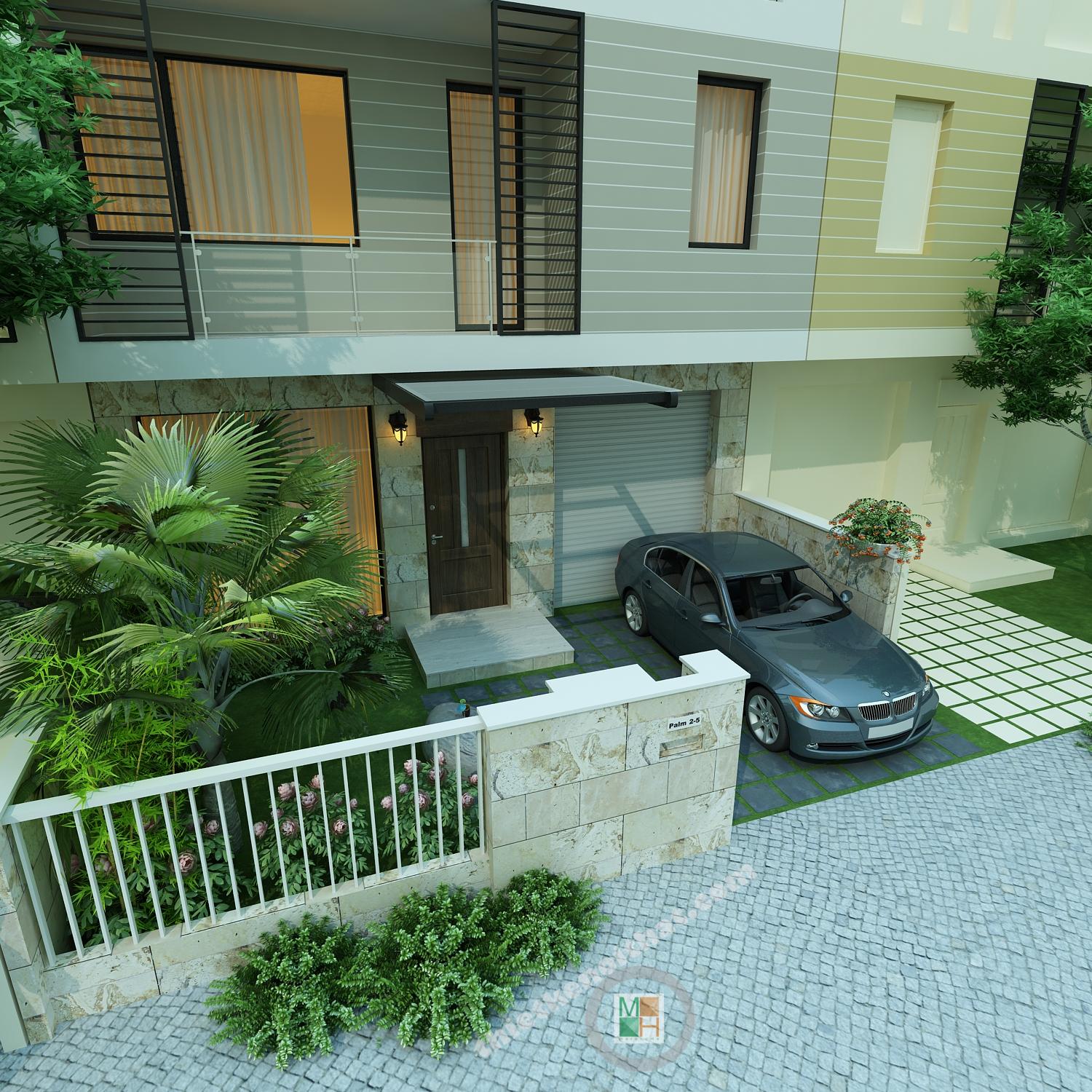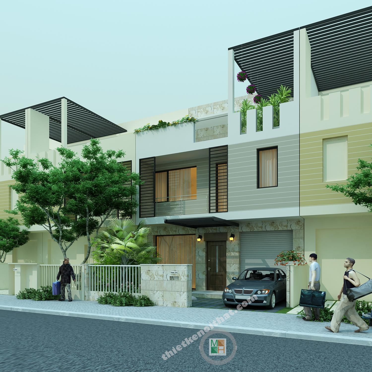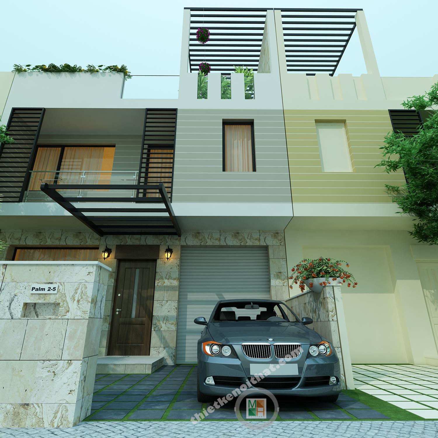 Bối cảnh mặt trước của căn biệt thự mini được thiết kế thoáng đãng với khu vườn cây nhỏ và lối vào gara rộng của ô tô. Tầng 1 được dành cho không gian sinh hoạt chung với phòng khách, bếp và gara ô tô.