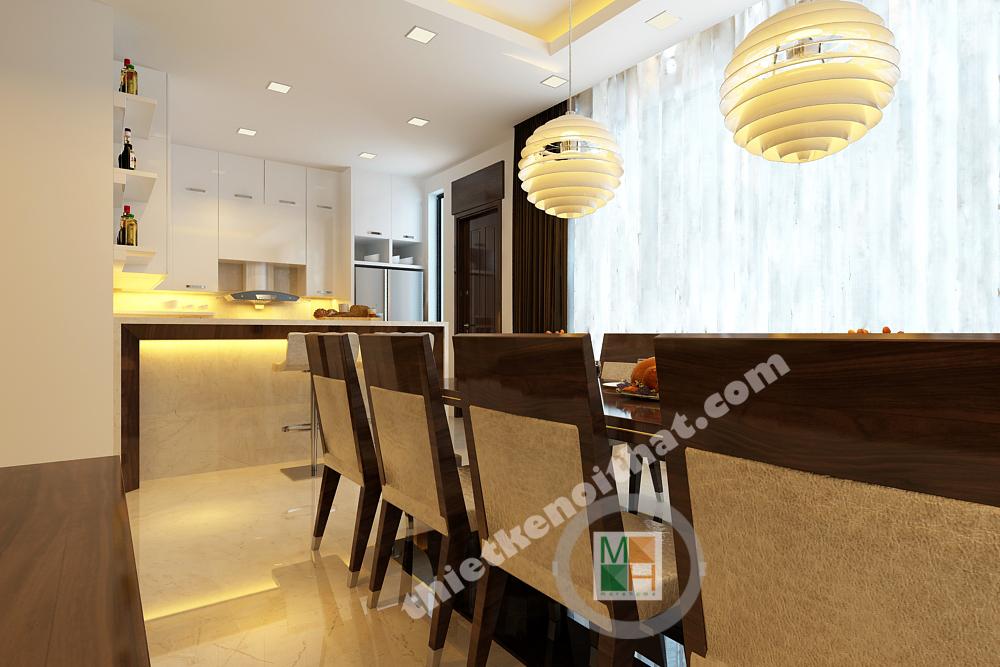 Bàn ăn làm bằng gỗ tự nhiên và được sơn bóng để phản chiếu ánh sáng, tạo hiệu ứng đẹp mắt khi bày ra những món ăn. Ánh sáng ở khu vực này được bổ sung nhờ cửa sổ đằng sau và những chiếc đèn thả đẹp mắt.
