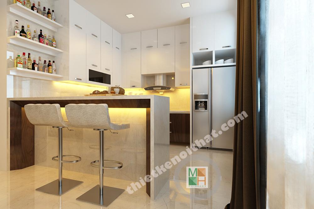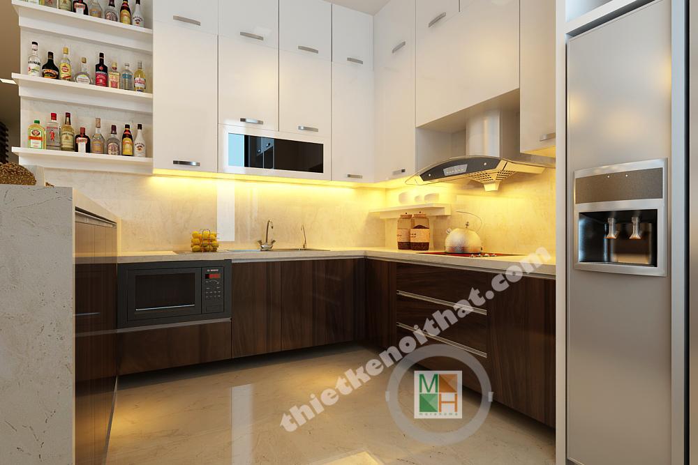 Căn bếp có diện tích không lớn nhưng rất hiện đại và đủ tiện nghi. Tủ bếp công nghiệp hiện đại két hợp với ánh đèn vàng để tạo nên không gian ấm cúng.