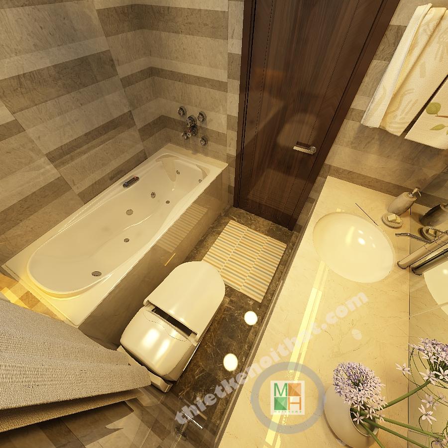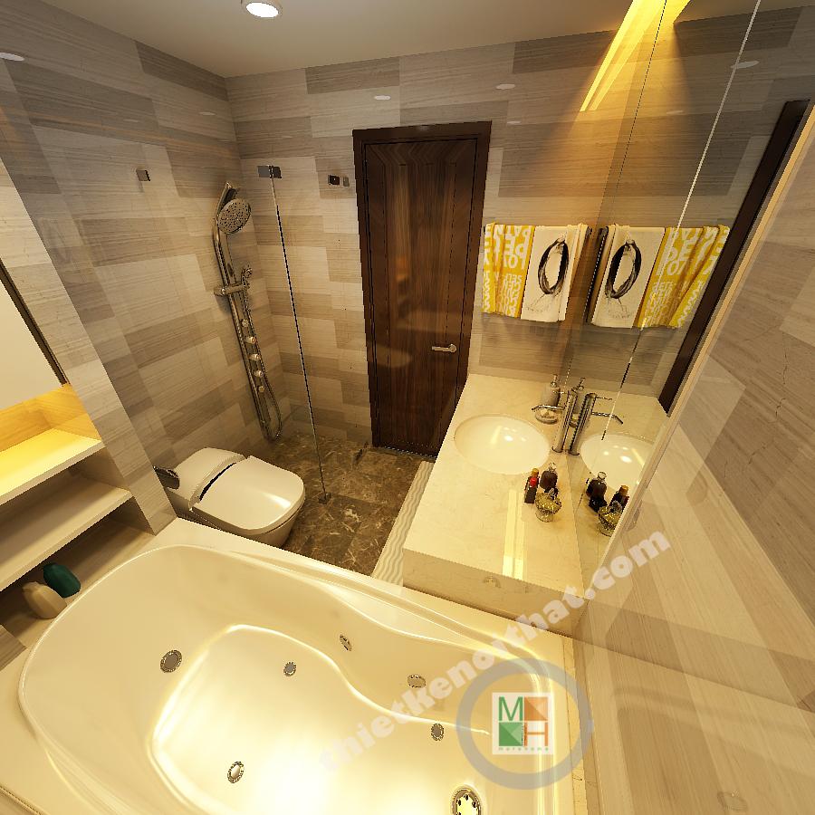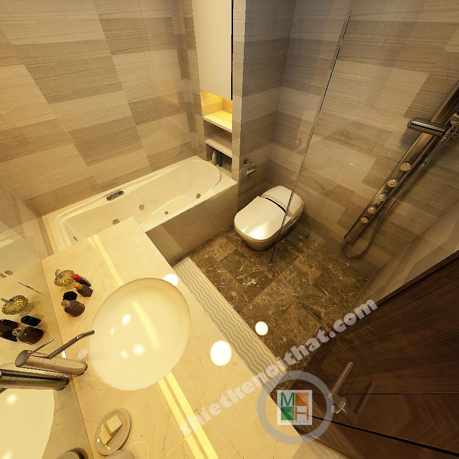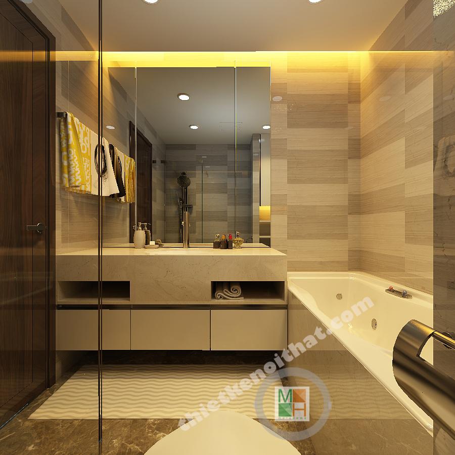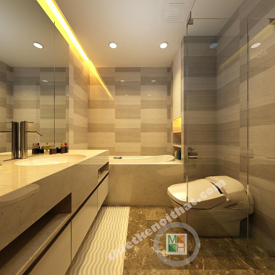 Phòng tắm hiện đại với các vật liệu nội thất kết hợp ánh sáng đèn màu vàng ấm áp để đem lại cảm giác thoải mái.