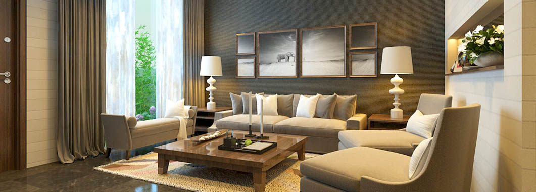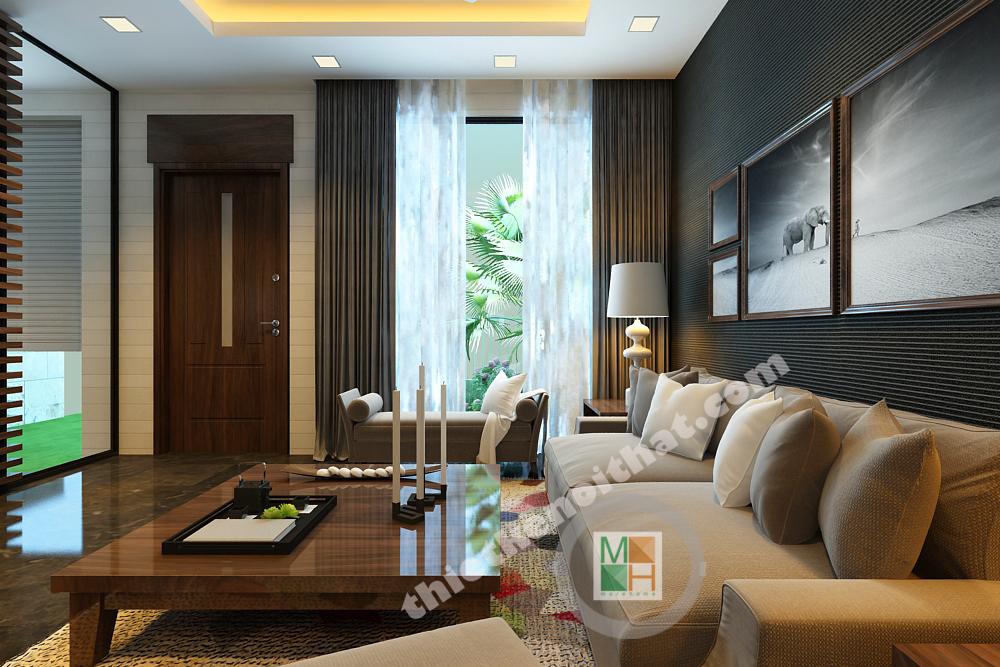 Thiết kế phòng khách chỉ sử dụng những gam màu trung tính đơn giản nhưng vẫn gây được chú ý nhờ cách bài trí khéo léo. Bộ sofa màu ghi nhạt đơn giản nhưng lại đem lại sự nhẹ nhàng, thoải mái cho người sử dụng. Chiếc thảm kê chân với họa tiết nhí tinh tế giúp phân vùng không gian.