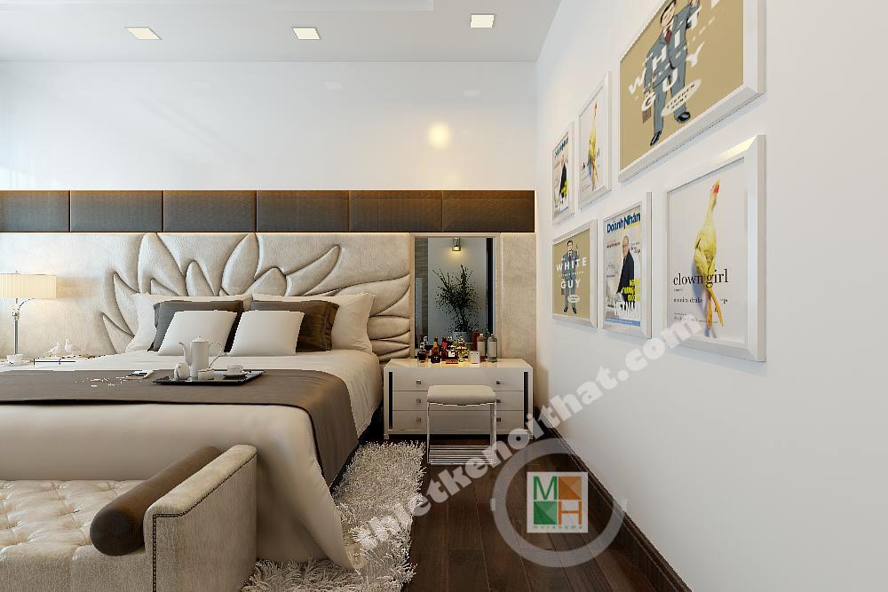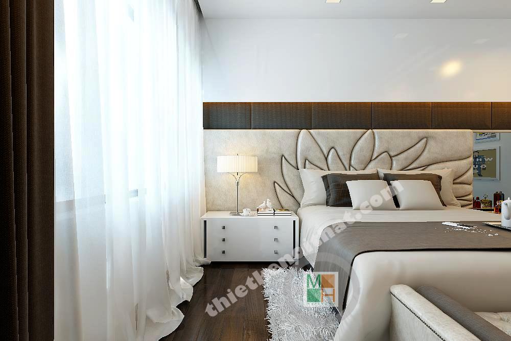 Nhờ mảng ốp tường vải hình hoa ở đầu giường cùng tông với giường ngủ và thảm trải sàn nên phòng ngủ chính trông rất sang trọng và đẳng cấp. Gam màu trắng chủ đạo kết hợp với ánh sáng từ cửa sổ làm căn phòng thêm lãng mạn.