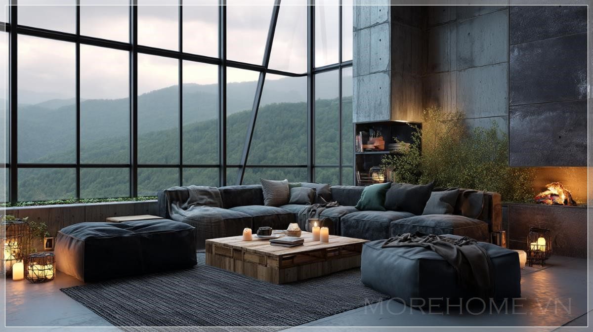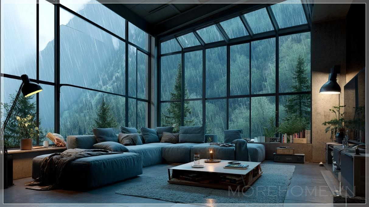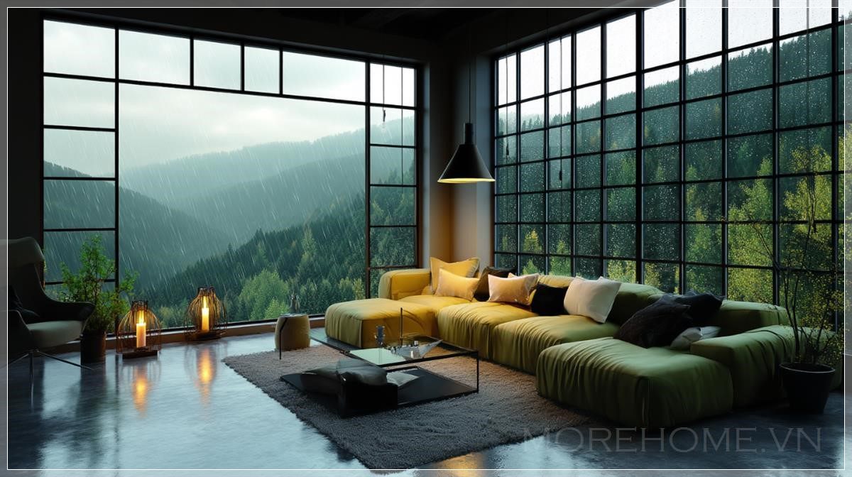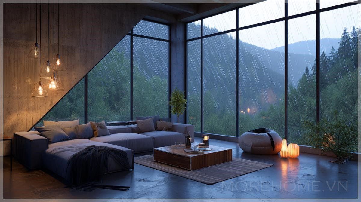 Phòng khách loft tuyệt đẹp, cửa sổ kính panoramic rộng lớn nhìn ra núi xanh và rừng, nội thất hiện đại đẹp mắt, vào buổi tối, phòng được chiếu sáng bởi những chiếc đèn bàn, bên ngoài trời đang mưa, thời tiết nhiều mây, không gian phòng khách ấm cúng.