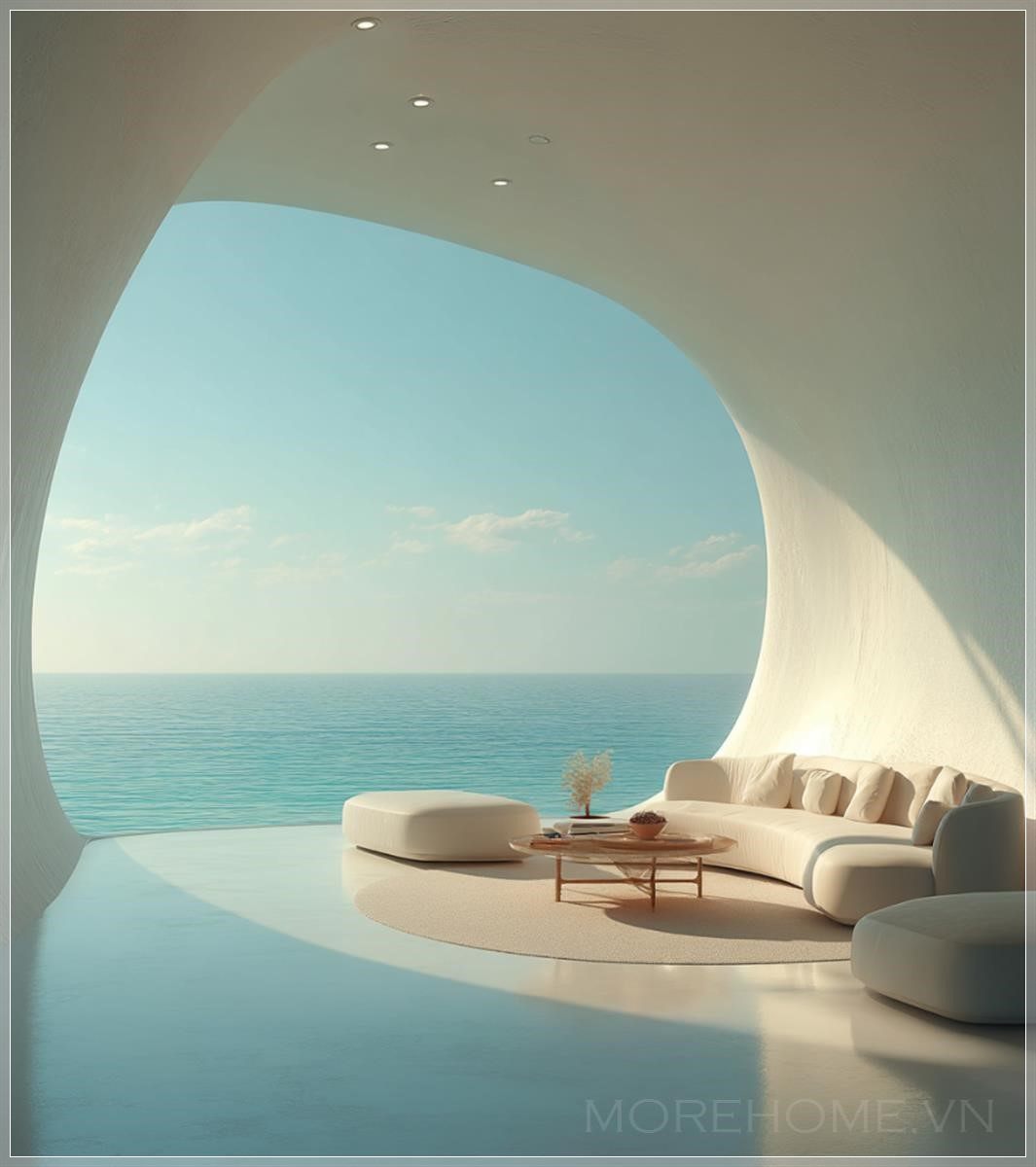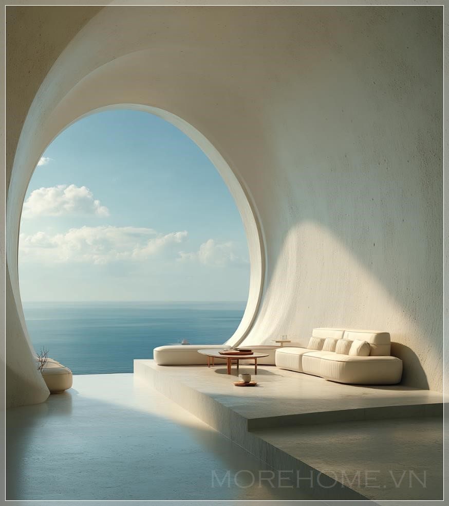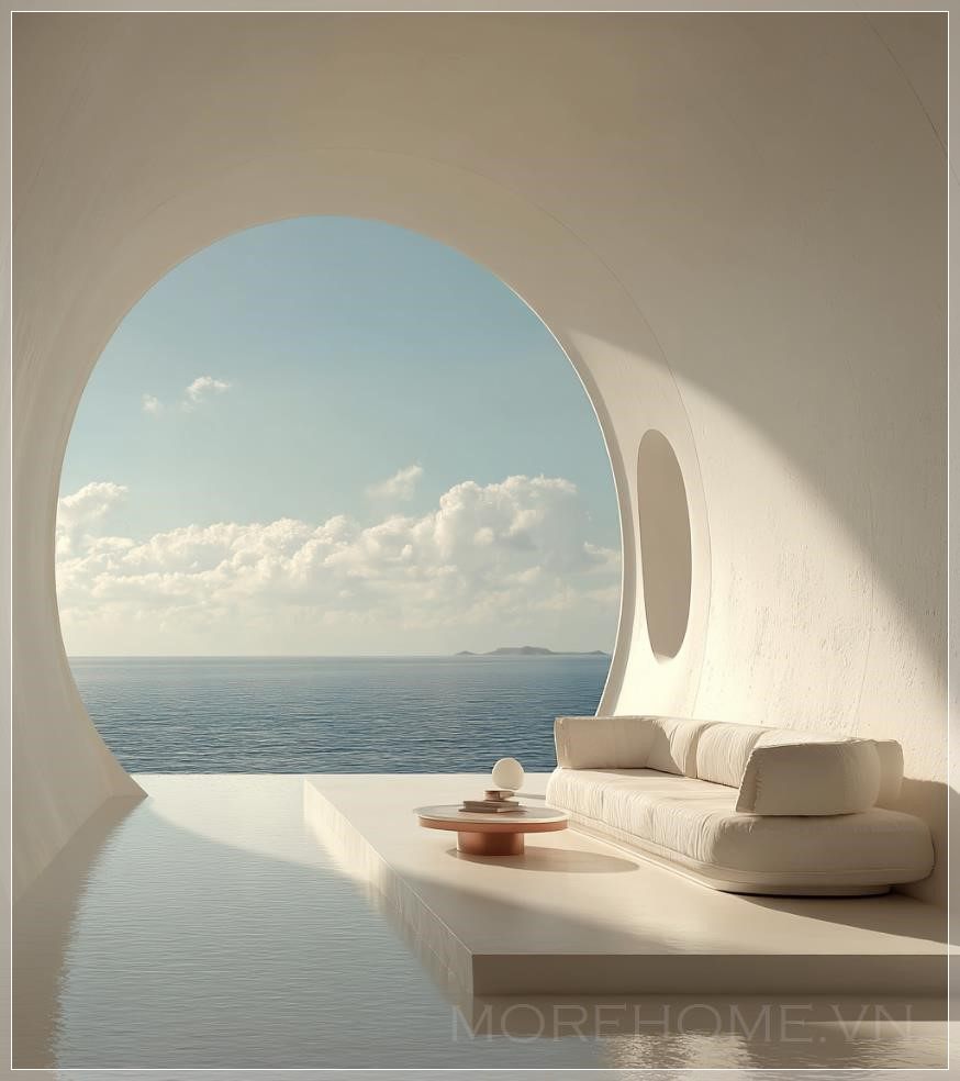 Nội thất màu trắng với cửa sổ hình bầu dục, một chiếc sofa và bàn đặt ở giữa, tường màu be sáng, tầm nhìn ra biển, phong cách tối giản, ánh sáng trắng từ trên chiếu xuống, không gian mềm mại và mơ màng, thiết kế tương lai, nền tảng nổi, nhiếp ảnh kiến trúc, siêu thực.