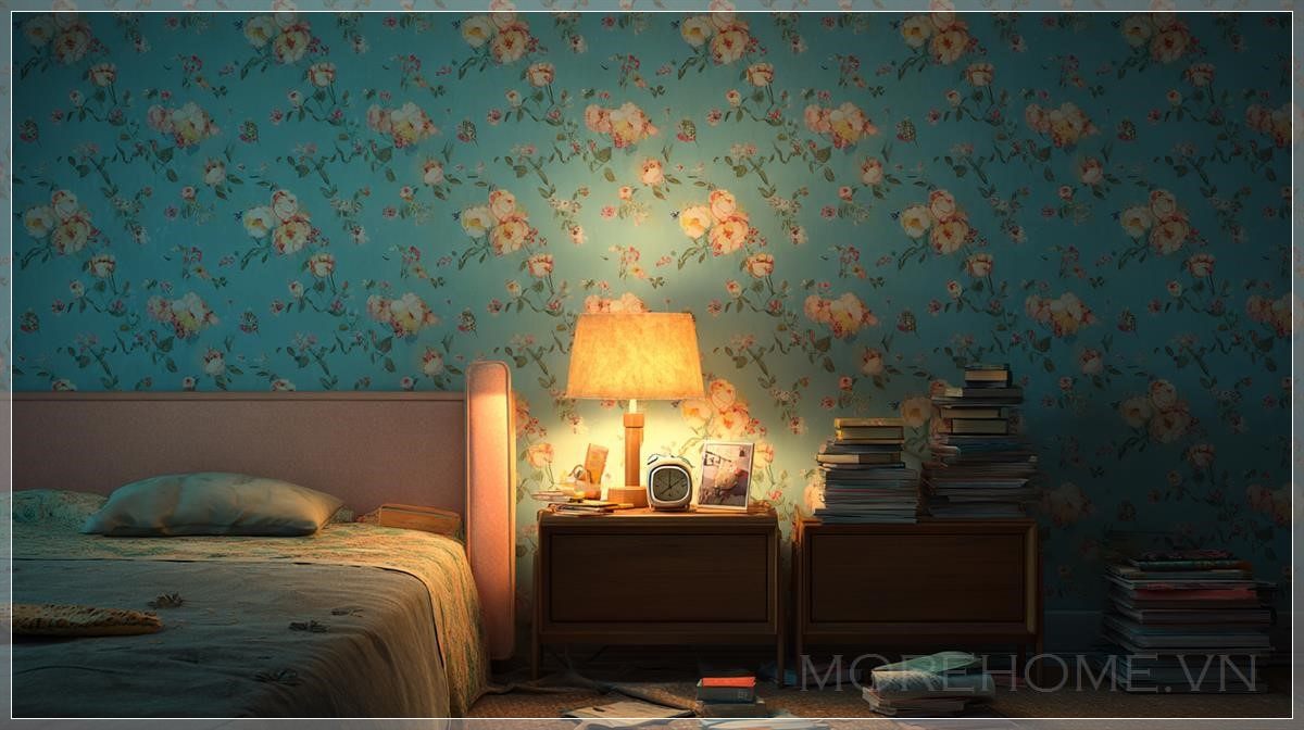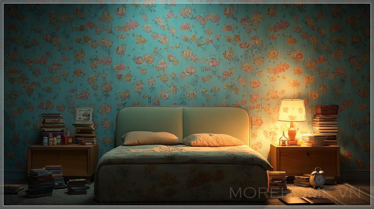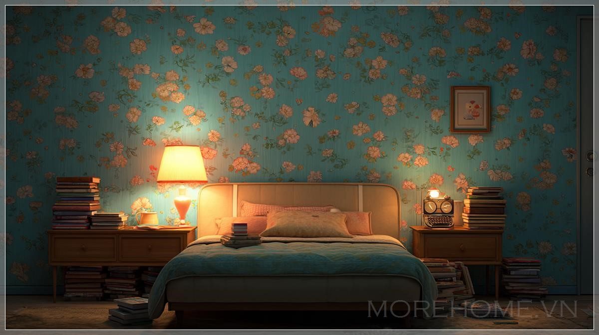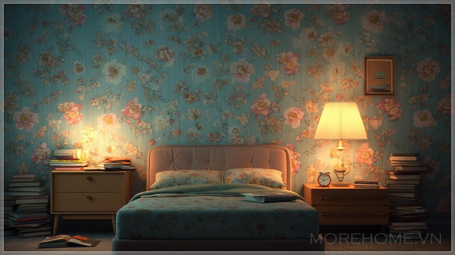 Phòng ngủ thập niên 1970, tường với bố cục phẳng, giấy dán tường màu xanh nhẹ với họa tiết hoa mềm mại, đầu giường bọc nệm màu pastel, hai bàn đầu giường bằng gỗ, mỗi bên chồng sách, bàn bên trái có đèn retro phát sáng và một chiếc đồng hồ báo thức nhỏ, ánh sáng ấm tạo ra bóng mềm mại trong căn phòng tối, một chồng sách nhỏ trên sàn gần giường, góc máy chụp ở tầm mắt, khung cảnh trung tâm, phong cách hoạt hình 3D, thiết kế phông nền kịch, không gian ấm cúng và đầy lãng mạn.