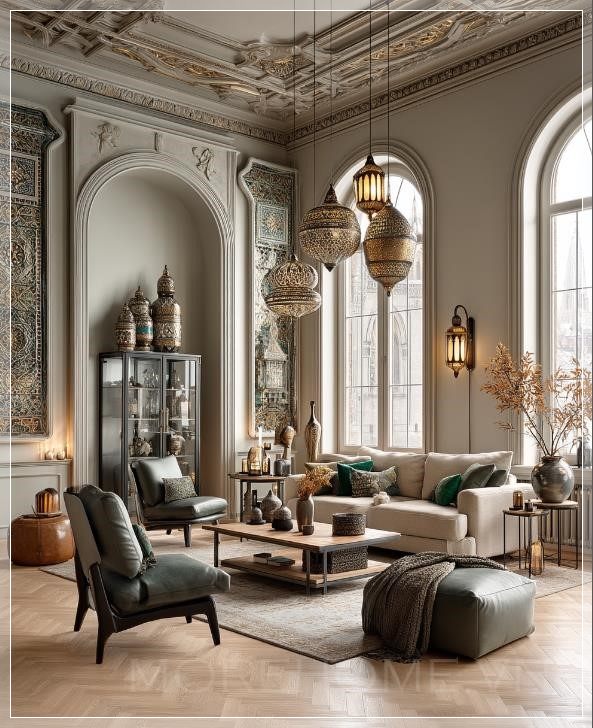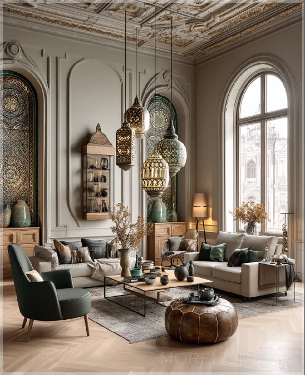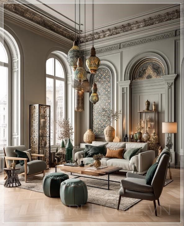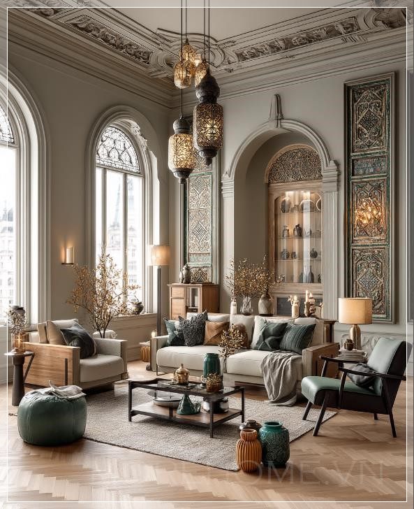 Phòng khách được bài trí đẹp mắt với phong cách Romania hiện đại, các kết cấu ấm cúng, ánh sáng ấm áp, đồ nội thất tinh tế với gam màu trung tính và điểm nhấn màu xanh, các yếu tố trang trí truyền thống bằng gốm được đặt một cách tinh tế, một gia đình thư giãn ở phía sau, chụp ảnh phong cách sống biên tập.