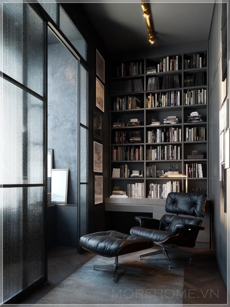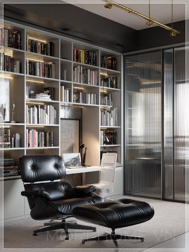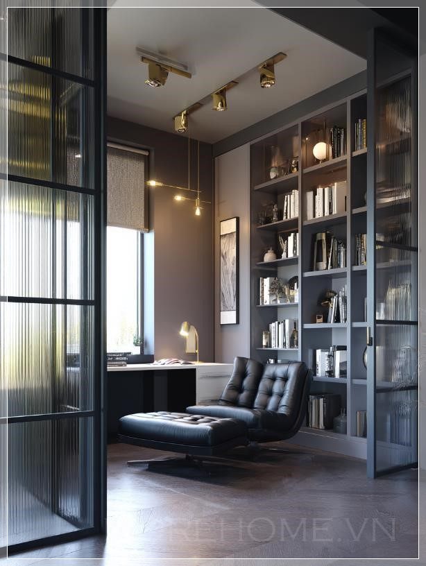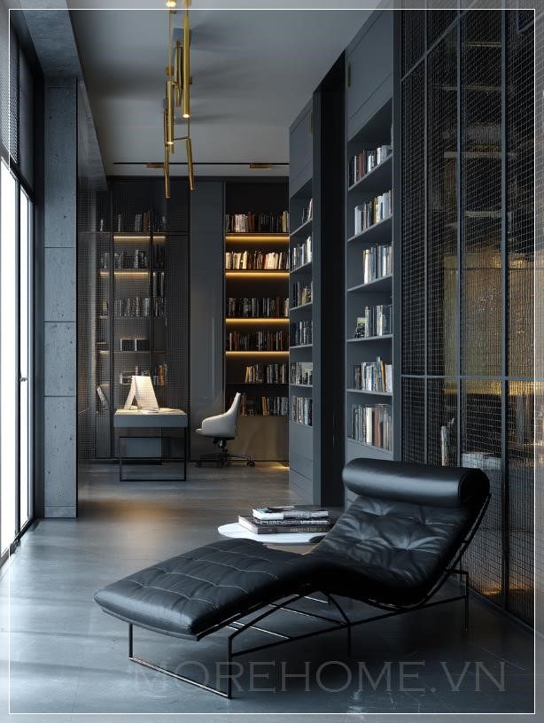 Phòng học hiện đại sang trọng với tông màu đen, trắng và xám, tủ sách xoay màu xám, bàn làm việc đứng motorized màu trắng, ghế dài bằng da đen, vách ngăn lưới kim loại, tường xám cách âm, đèn rọi vàng nổi, hệ thống điều khiển khí hậu thông minh, cửa kính xám có gradient, hình ảnh render chi tiết 8k, chụp ảnh thực tế.