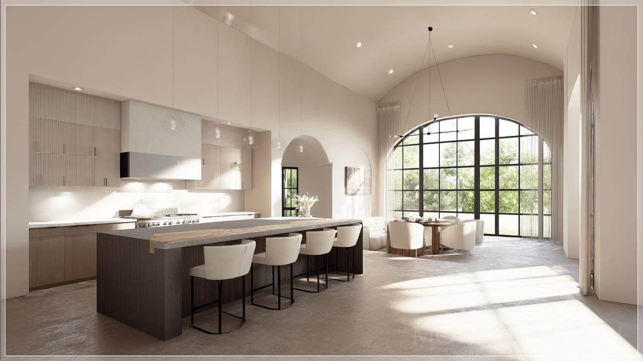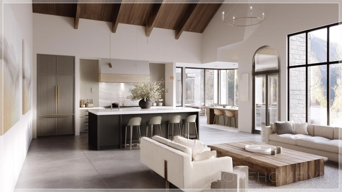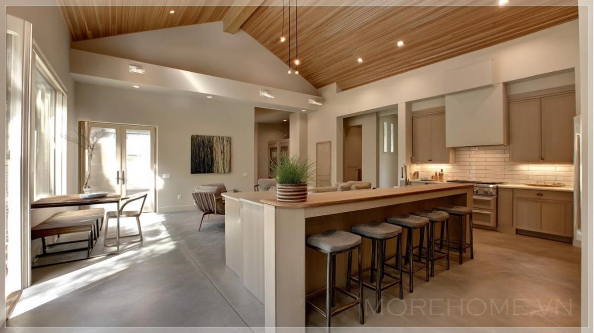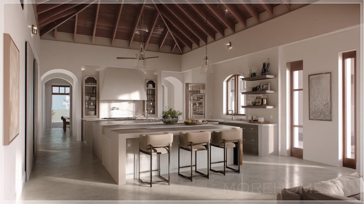 Khu vực phòng khách và bếp tích hợp với tông màu trung tính, trần vòm cao, quầy đảo với ghế bar, sàn bê tông, mang đến không gian thanh lịch và yên tĩnh, lấy cảm hứng từ Kardami. Liên hệ: https://zalo.me/morehomevietnam