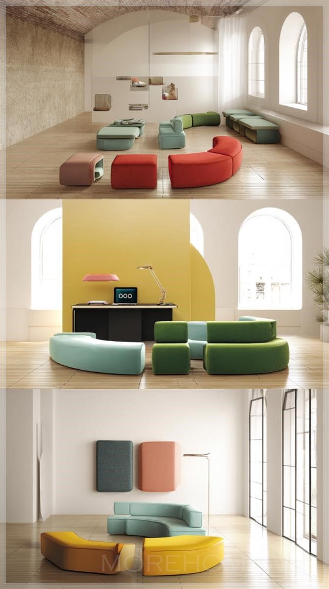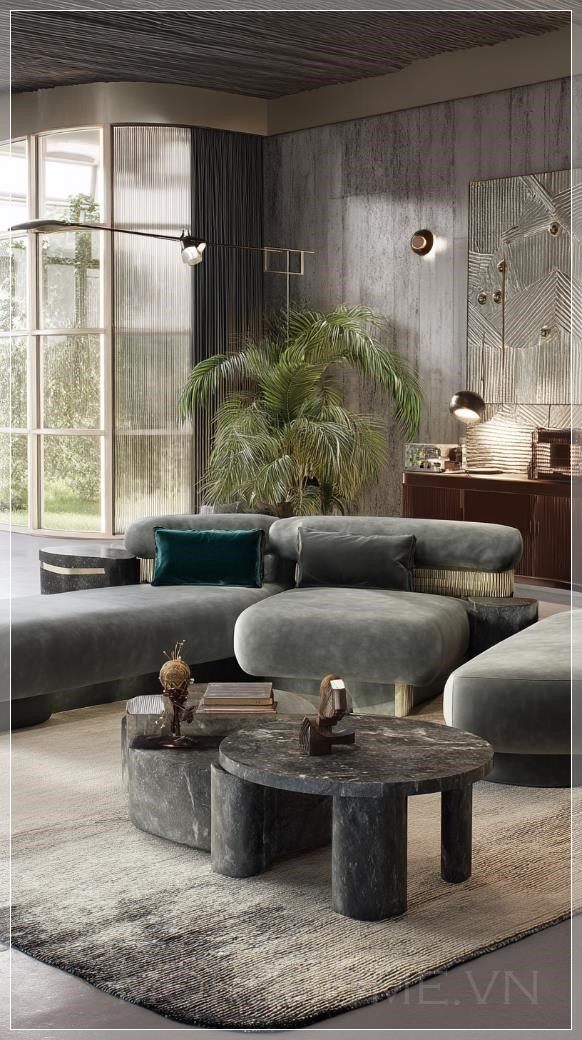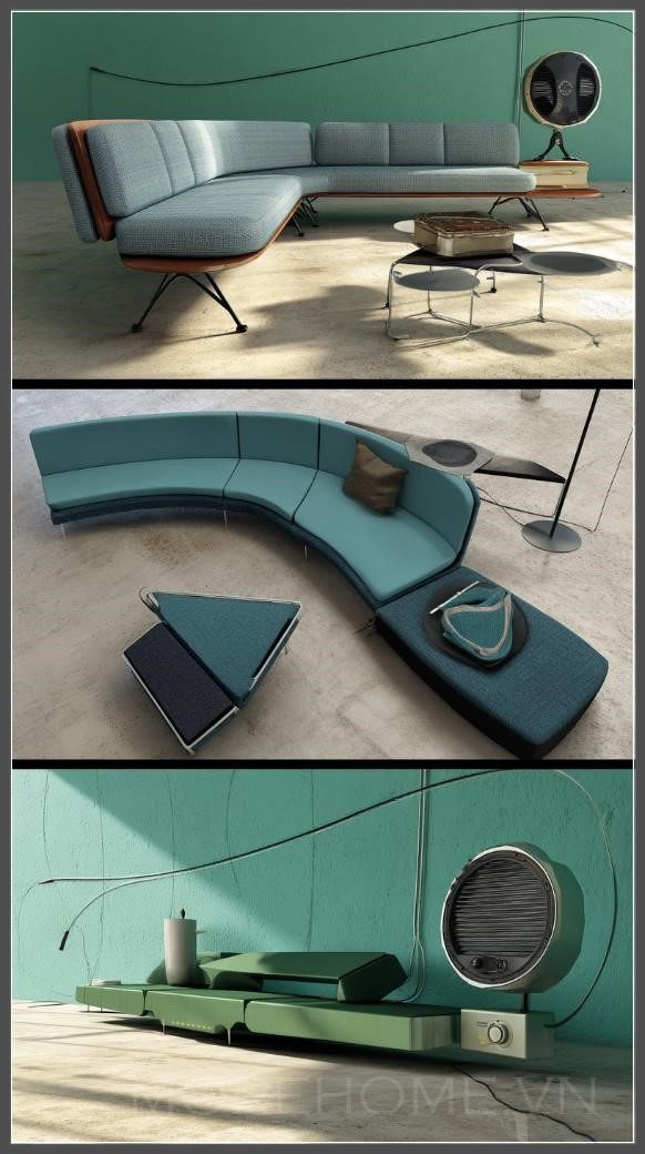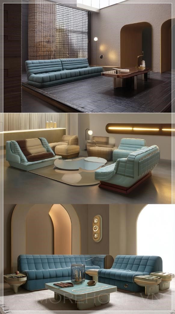Phòng khách sáng tạo Aquarius: Ghế ngồi modular với hình dạng bất đối xứng, kết hợp giữa những món đồ vintage và hiện đại, cùng với các thiết bị công nghệ độc đáo làm điểm nhấn trang trí. Liên hệ: https://zalo.me/morehomevietnam