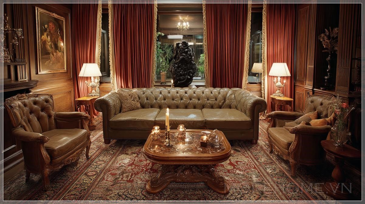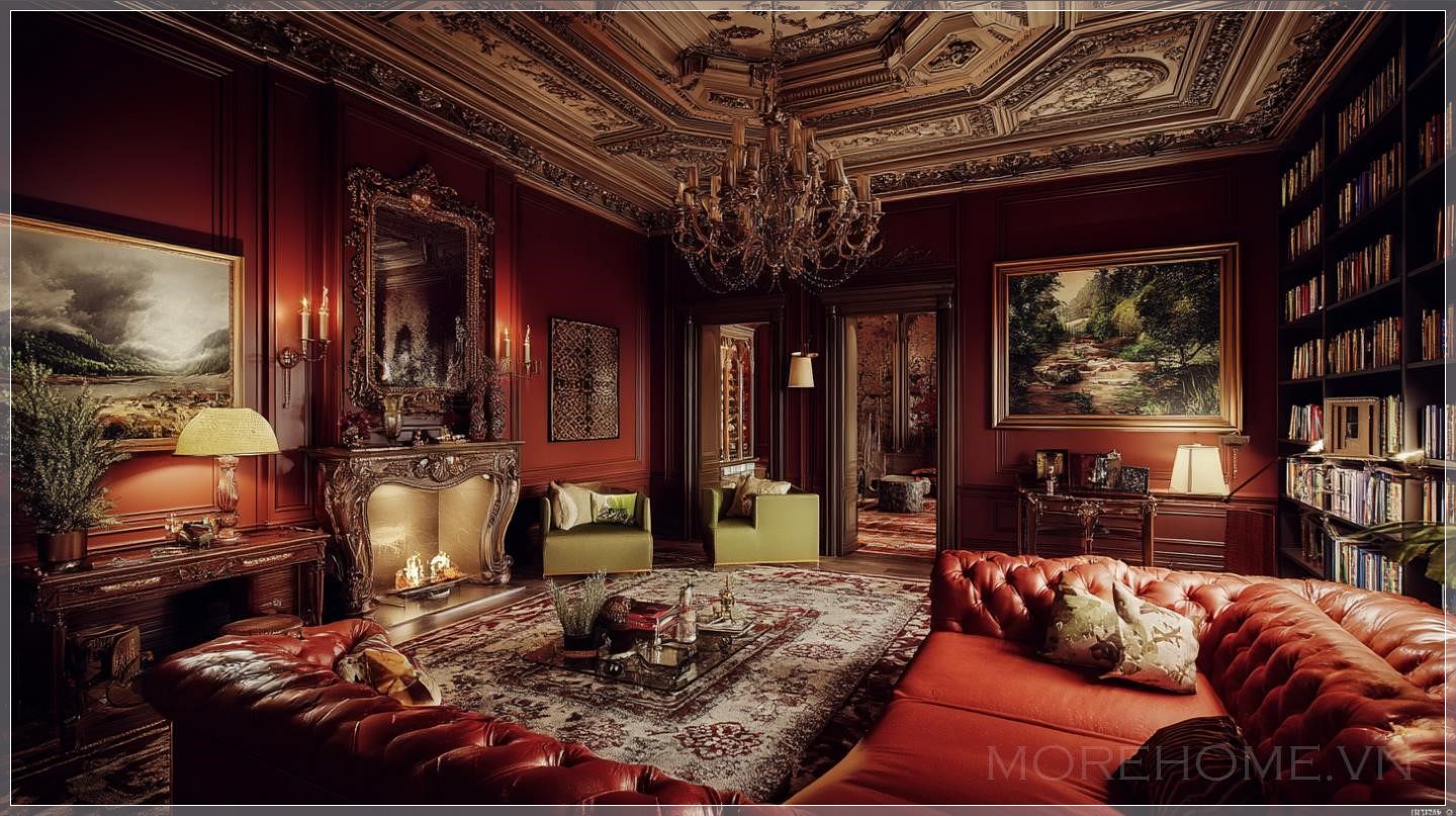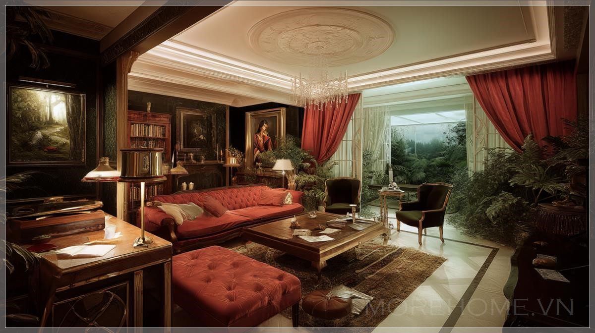 Phòng khách sang trọng với nền tường màu xám đậm, kết hợp với sàn gỗ tối màu tạo nên không gian ấm áp và tinh tế. Bộ sofa bọc vải nhung màu xanh đậm, cùng những chiếc gối trang trí bằng vải lụa với họa tiết kim tuyến làm điểm nhấn cho không gian. Bàn trà bằng đá cẩm thạch trắng, với chân vàng bóng loáng, đặt giữa phòng, tạo sự cân đối và hài hòa. Những chiếc đèn chùm pha lê lấp lánh, cùng với hệ thống chiếu sáng âm trần nhẹ nhàng, làm nổi bật vẻ đẹp của không gian. Từng chi tiết nhỏ đều được chăm chút, tạo nên một không gian sống đẳng cấp và đầy quyến rũ.