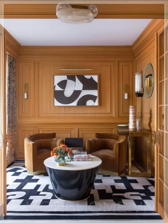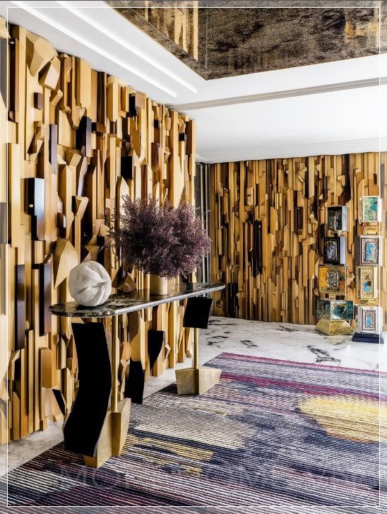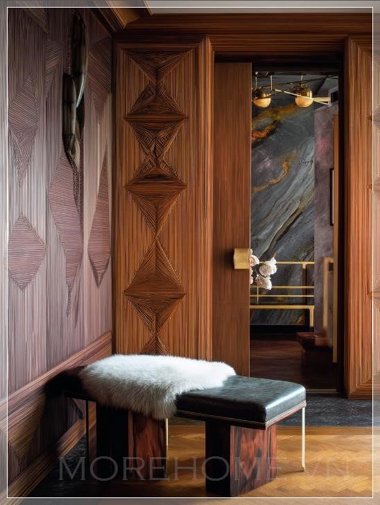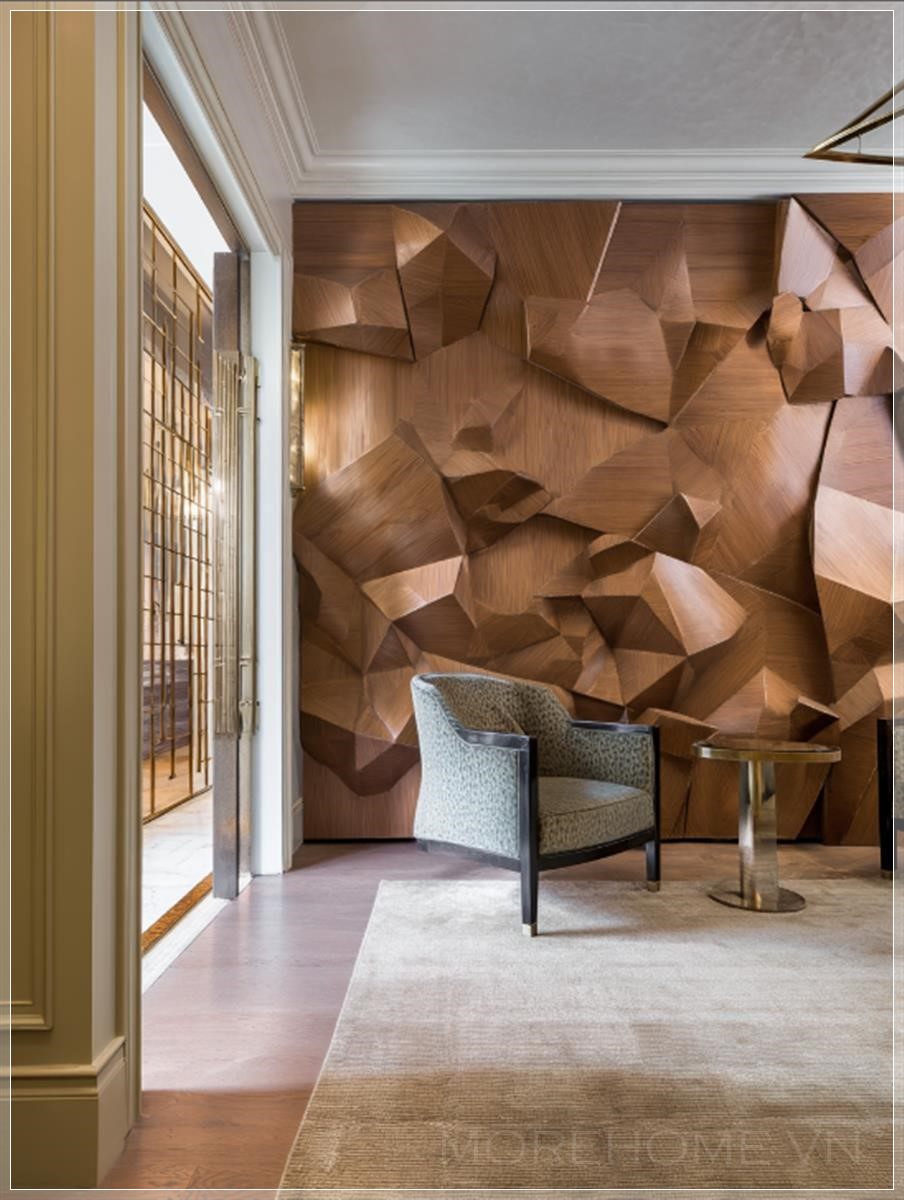 Lối vào phòng khách lấy cảm hứng từ Kelly Wearstler với các tấm ốp gỗ hình học trừu tượng, kết hợp giữa nét hiện đại và sự ấm áp của vật liệu tự nhiên. Các tấm gỗ được thiết kế tinh tế với các đường nét uốn lượn, tạo ra không gian sang trọng và ấn tượng ngay từ cái nhìn đầu tiên. Ánh sáng tự nhiên chiếu qua cửa sổ, làm nổi bật vẻ đẹp của các chi tiết gỗ và tạo cảm giác chào đón, thư giãn.