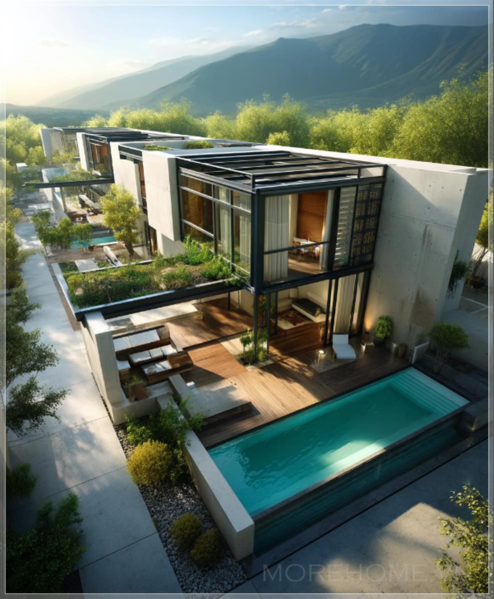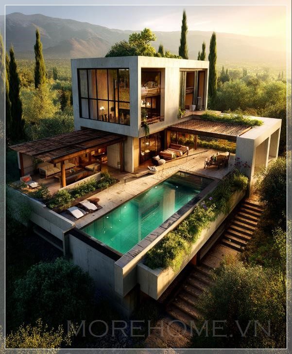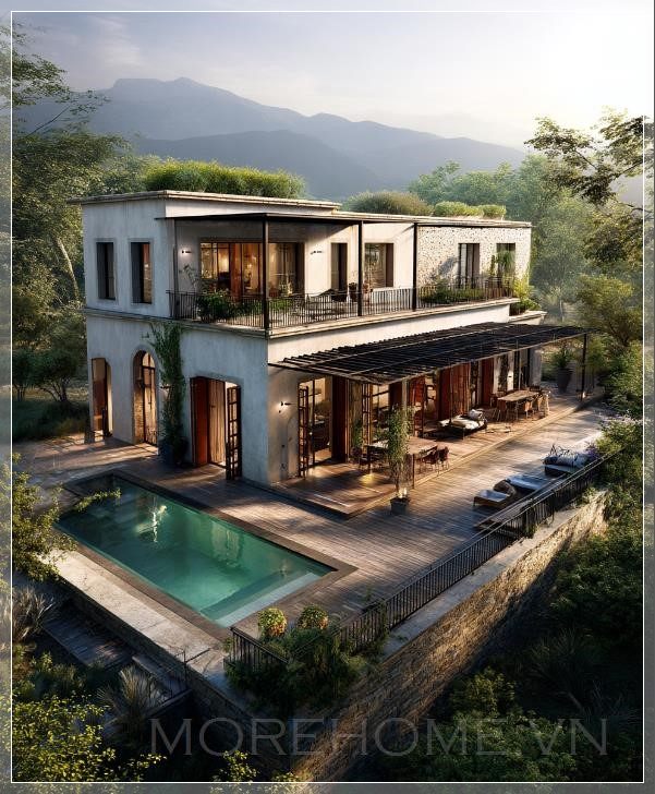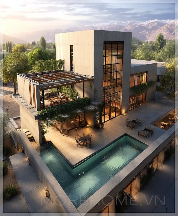 Một góc nhìn thực tế từ trên cao về ngoại thất của một biệt thự hai tầng hình chữ L với mặt tiền bằng xi măng trắng. Máy ảnh ghi lại một cảnh quay với ống kính góc rộng, làm nổi bật cả biệt thự và khu vực xung quanh. Biệt thự có các cửa sổ lớn ở tầng trệt hướng ra sân vườn và hồ bơi, mái hiên theo kiểu pergola với các cửa sổ lớn và ban công dài trên tầng hai, tích hợp không gian xanh. Biệt thự được thiết kế theo phong cách kiến trúc truyền thống Iran, kết hợp giữa sự thoải mái hiện đại và thiên nhiên. Nó nằm ở khu vực nông thôn với tầm nhìn ra dãy núi và những cây cối xung quanh. Ánh sáng tự nhiên nhẹ nhàng làm nổi bật không gian thanh bình của biệt thự và sự hòa hợp với môi trường yên tĩnh xung quanh.