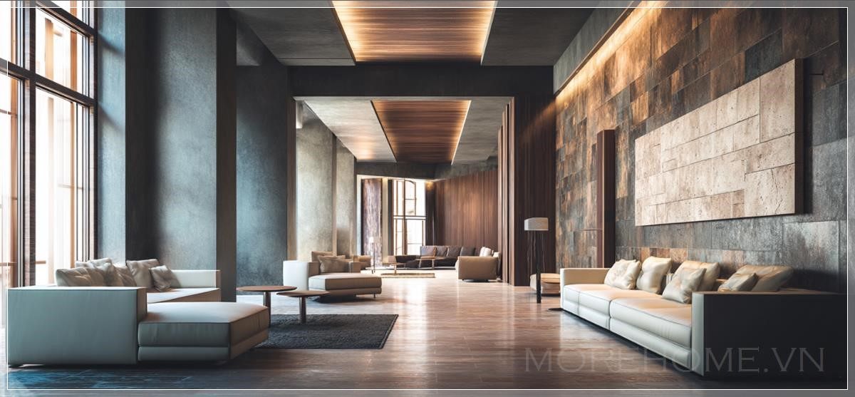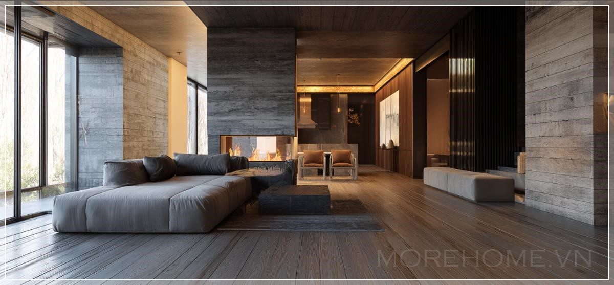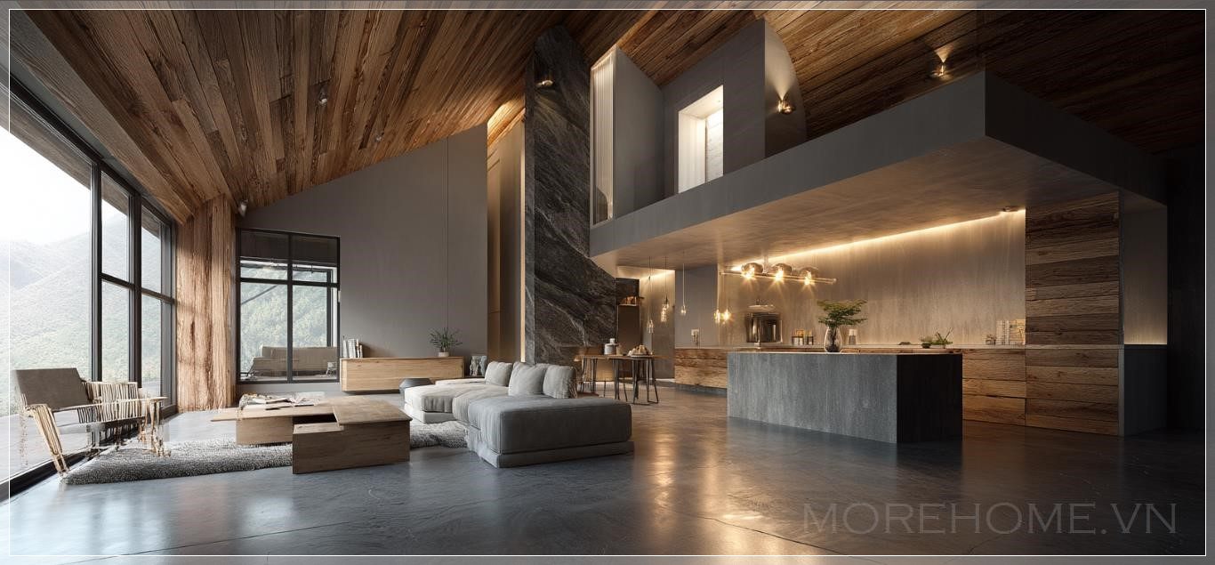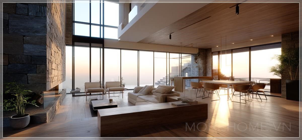Không gian nội thất sang trọng, hiện đại, ngập tràn ánh sáng ấm áp nhẹ nhàng, nhìn từ góc rộng. Các vật liệu tự nhiên như gỗ và đá tạo nên sự kết hợp hoàn hảo, phong cách kiến trúc cao cấp và tinh tế. Nội thất tối giản, thanh lịch, với ánh sáng phim điện ảnh tạo nên bầu không khí cao cấp, đẳng cấp và đầy quyến rũ.
