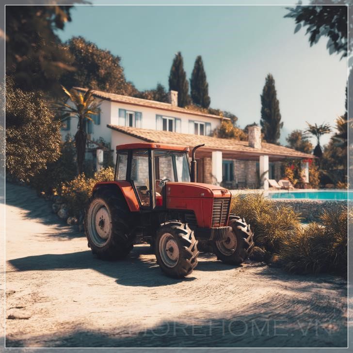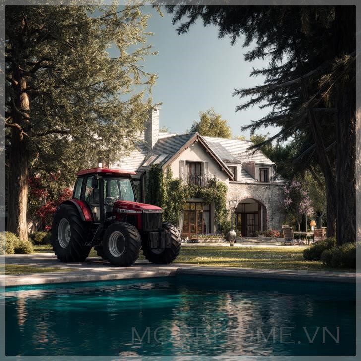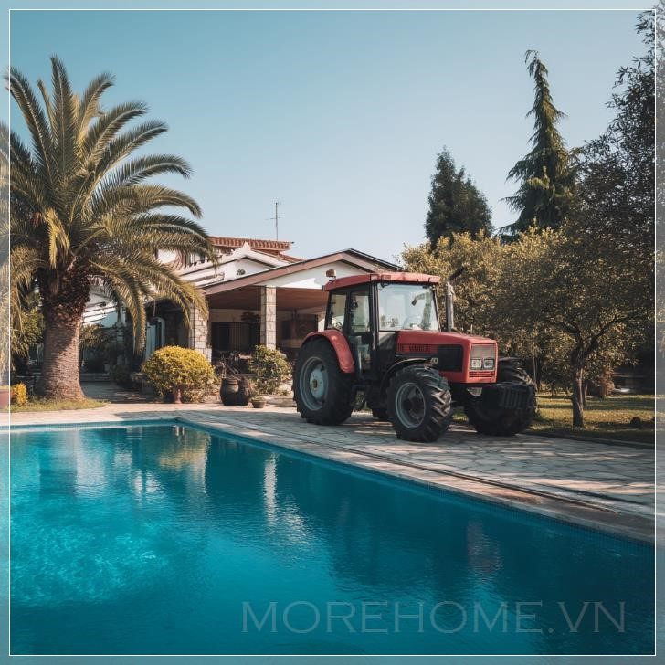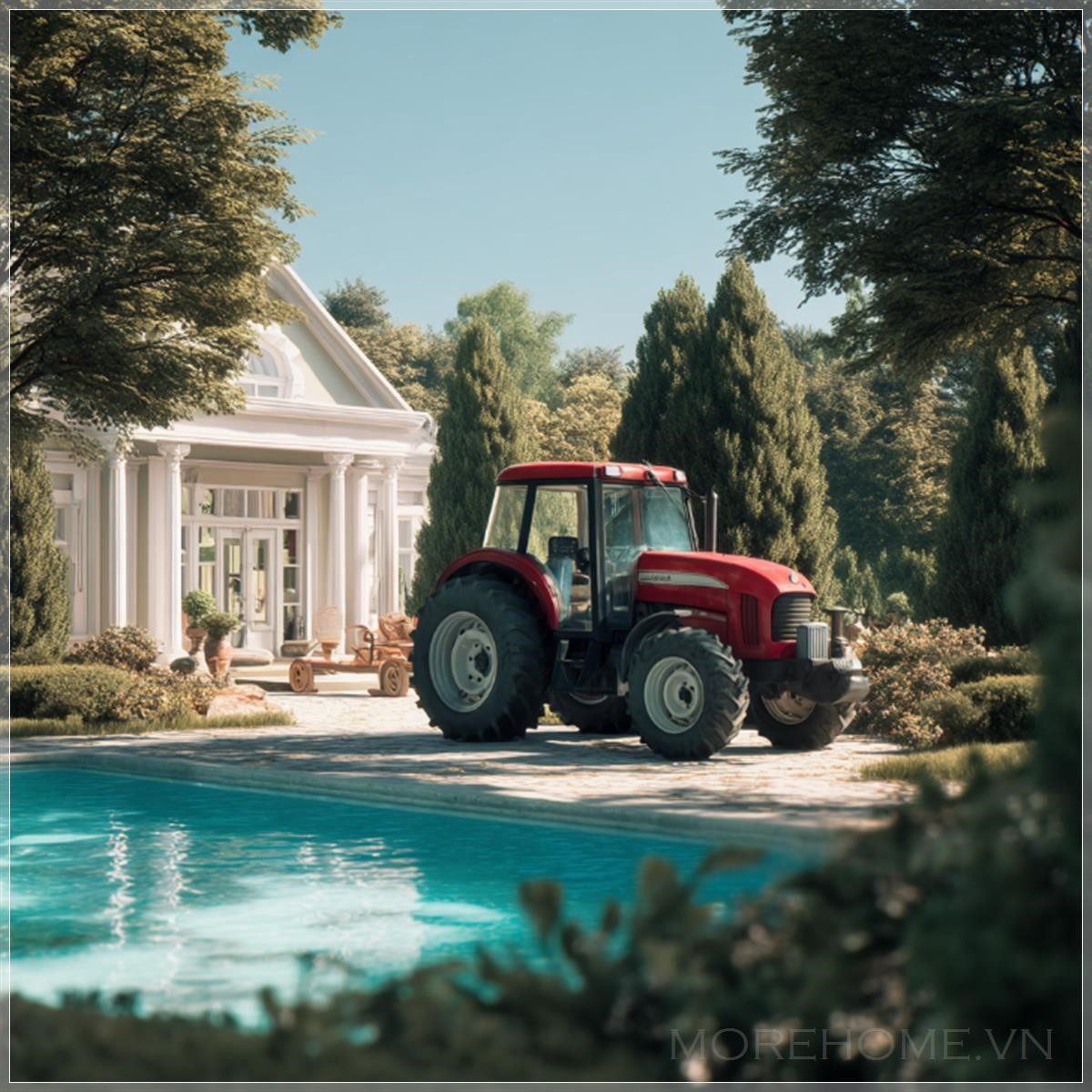 Tractor đỏ gần ngôi nhà riêng biệt, đắt tiền với rất nhiều cây cối xung quanh và bể bơi lớn riêng tư, một ngày hè nắng. Tập trung vào chiếc máy kéo lớn và ngôi nhà đẹp trong thực tế 4K. Liên hệ: https://zalo.me/morehomevietnam