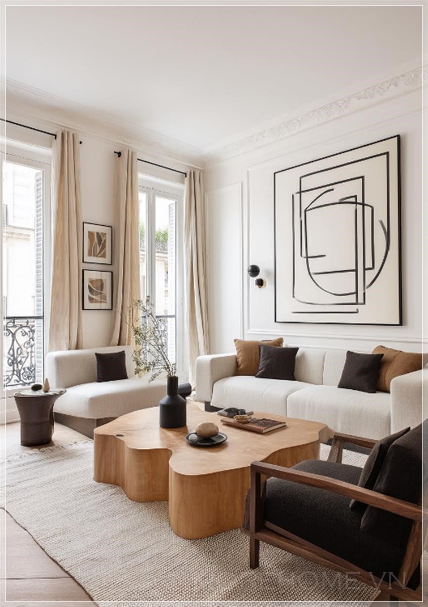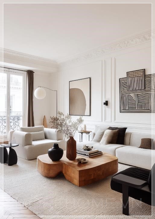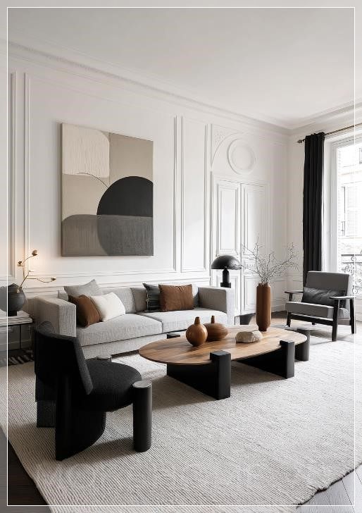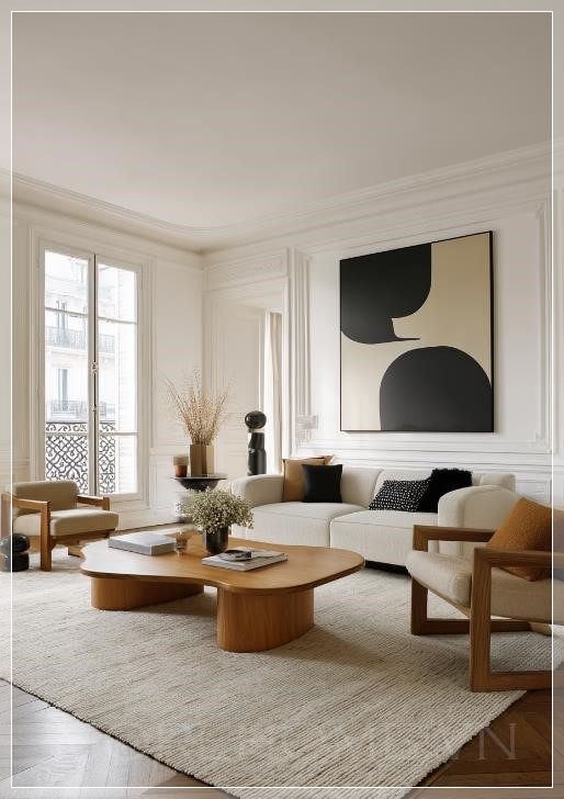 Phòng khách của một căn hộ Paris hiện đại, với tường trắng và những chi tiết gỗ tối đẹp mắt. Một tác phẩm nghệ thuật trừu tượng lớn trang trí trên tường, kết hợp với đồ nội thất hiện đại theo phong cách tối giản và thanh lịch. Các tông màu trung tính được điểm xuyết bằng những mảng đen và nâu, và một chiếc bàn cà phê có hình dạng tự nhiên lớn đặt trên tấm thảm ấm cúng. Góc nhìn trực diện.