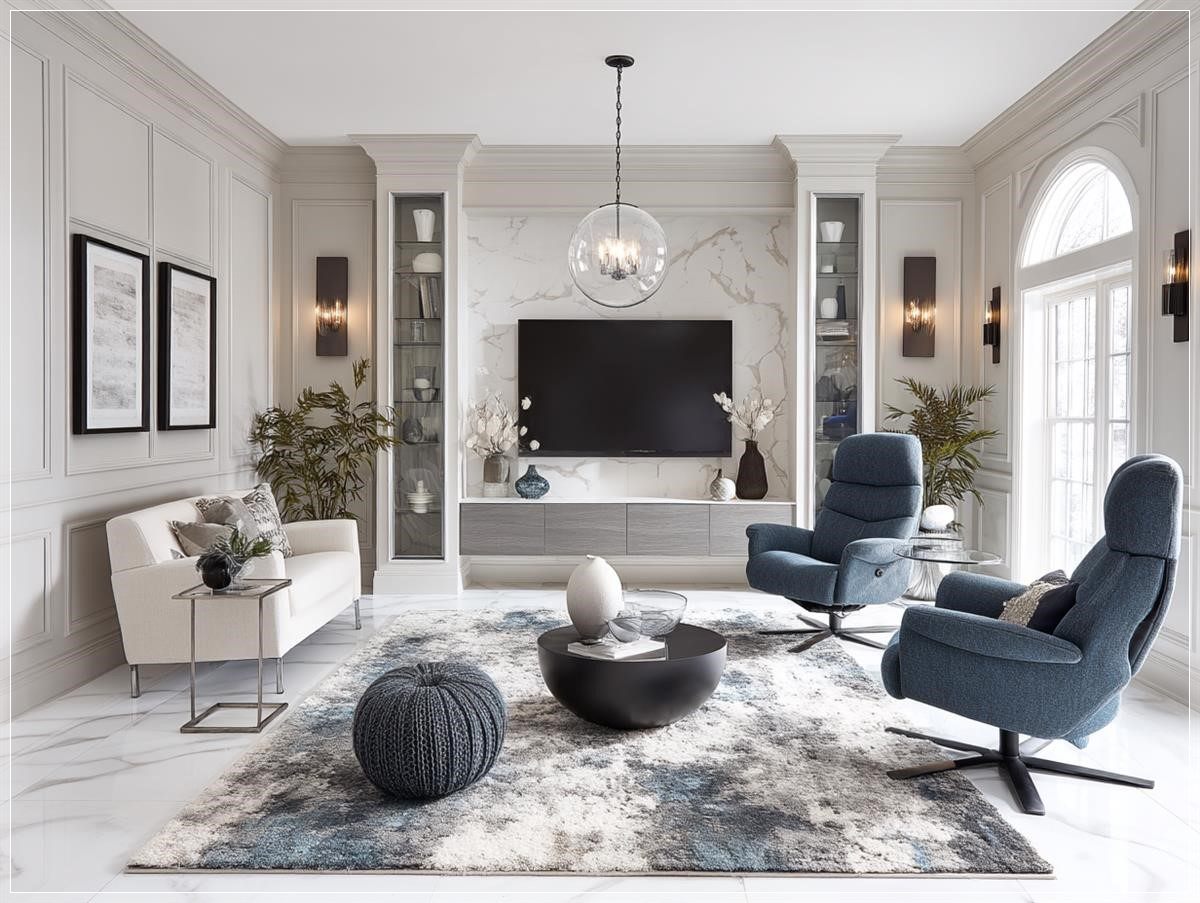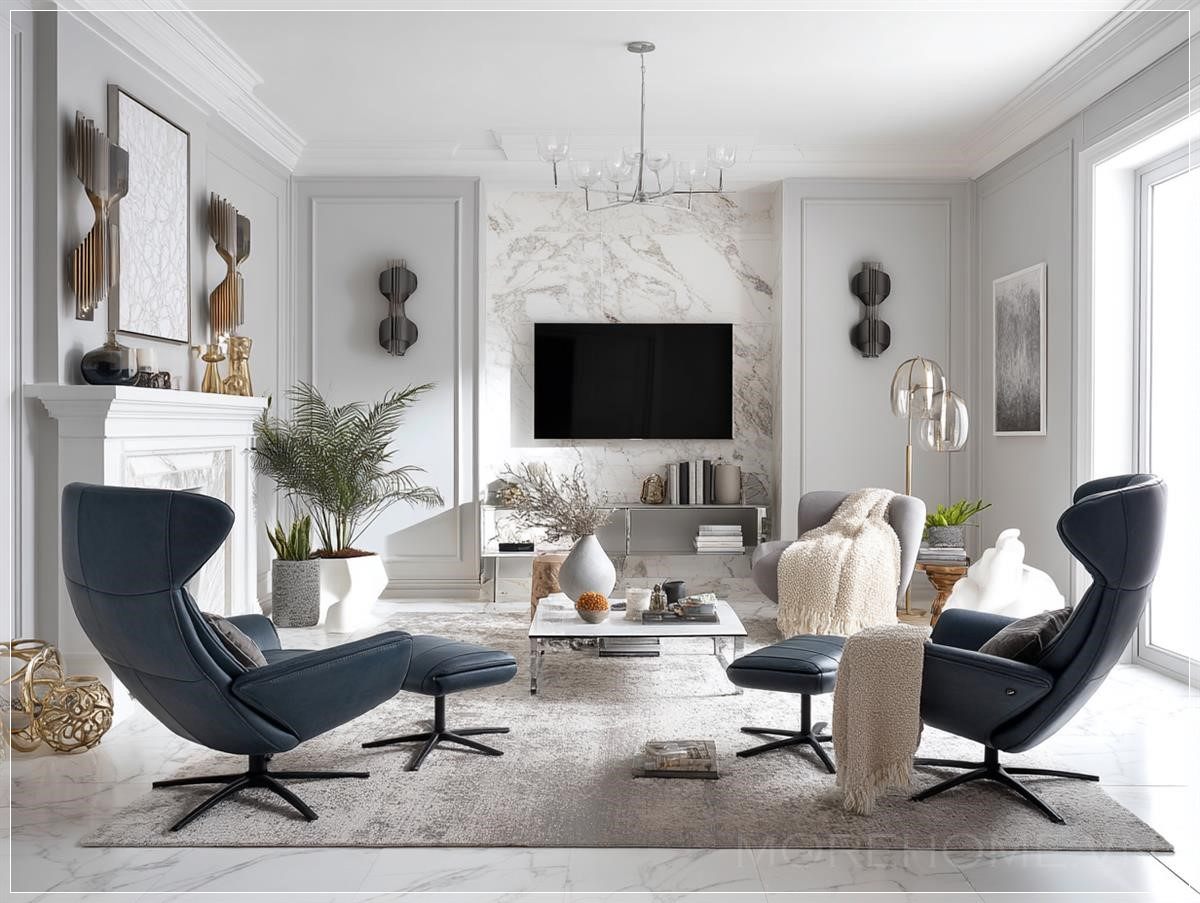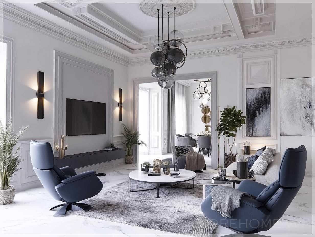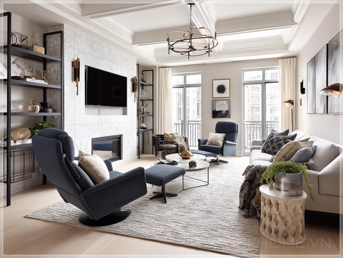 Phòng khách hiện đại pha trộn hoàn hảo giữa phong cách tân cổ điển và Scandinavian. Màu sắc chủ đạo là gam màu greige, trắng, than chì và xanh navy phai. Sàn nhà được lát bằng đá marble trắng. Một tấm thảm trừu tượng màu greige trải trên sàn. Phía trước TV là hai chiếc ghế Fjords Axel Recliners màu xanh navy với chân kim loại đen, đặt đối diện nhau theo góc 90 độ. TV được đặt giữa hai chiếc đèn tường màu nâu than chì.