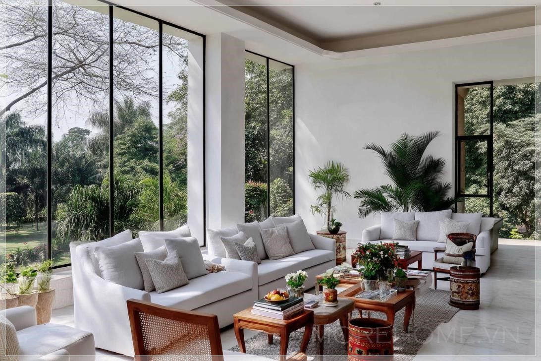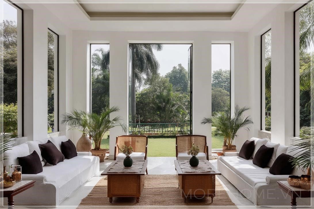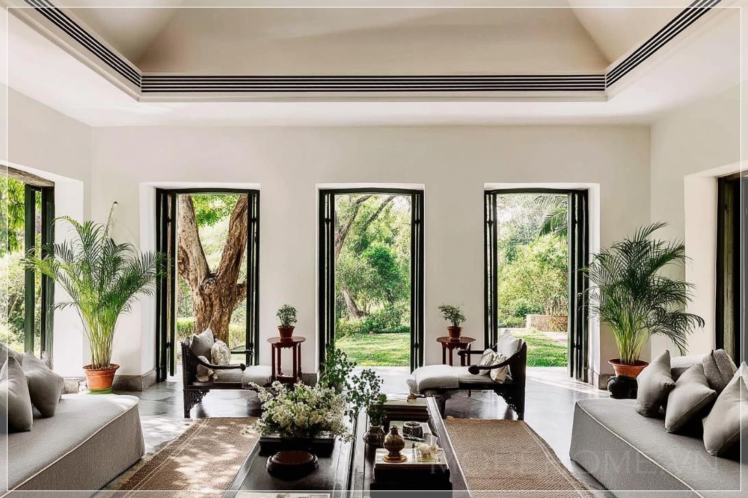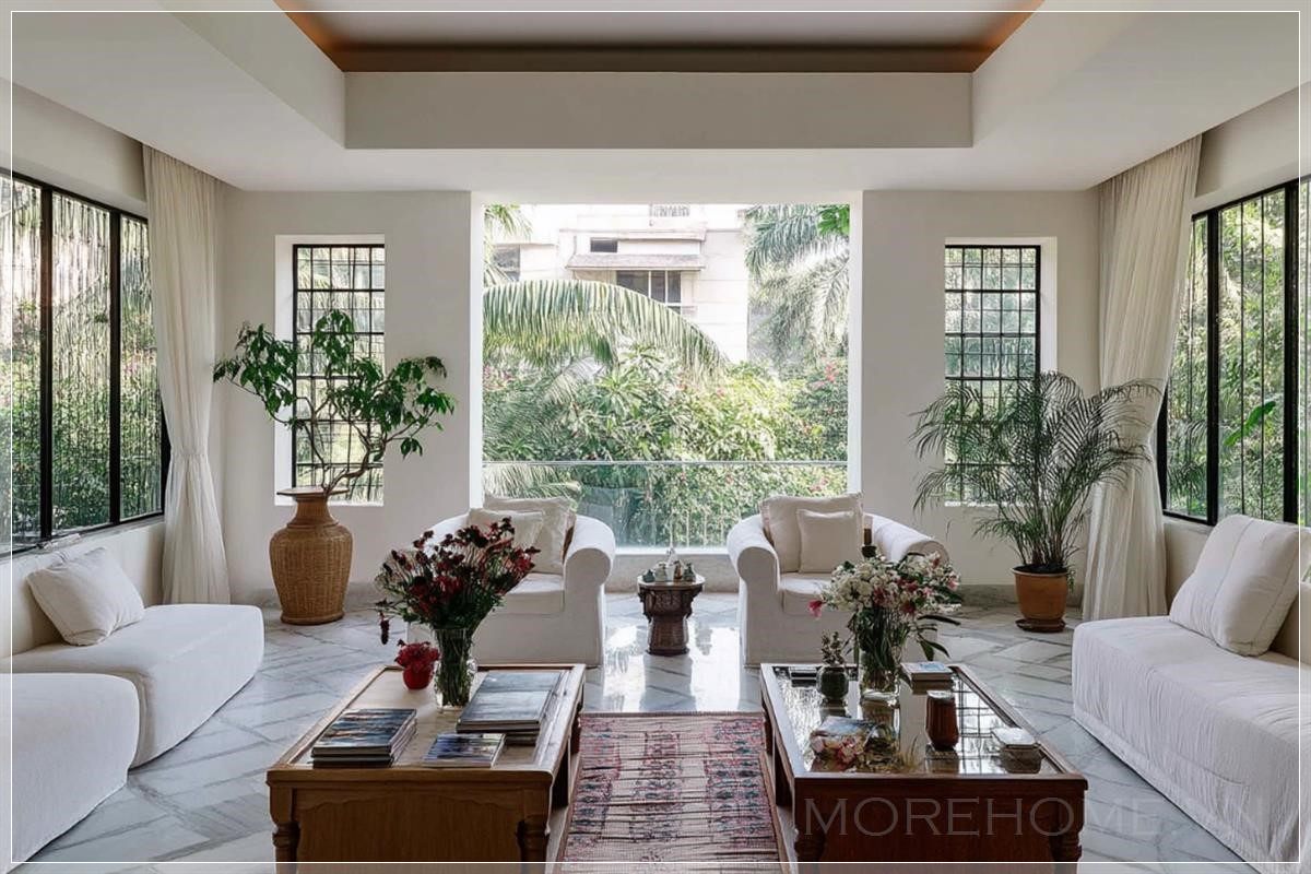 Phòng khách trang trọng trong một biệt thự 10.000 sq.ft tại Ấn Độ, không gian rộng rãi và tinh tế được thiết kế để có thể tiếp đón 20 người một cách thoải mái, bố cục đối xứng với nhiều ghế sofa bọc vải linen và ghế armchair cổ điển, cửa sổ nhôm dáng mảnh cao từ trần đến sàn, mang đến tầm nhìn ra khu vườn. Không có yếu tố hiên ngoài, tường phủ vữa vôi trắng, trần phẳng với hệ thống chiếu sáng âm và chiếu sáng vòm. Bàn trà trung tâm bằng gỗ truyền thống, thảm dệt tay với màu sắc nhẹ nhàng, một hoặc hai chậu cây cảnh trong nhà, các tác phẩm nghệ thuật Ấn Độ được tuyển chọn như tranh Pichwai hoặc tranh thu nhỏ. Bảng màu trung tính, kết hợp giữa phong cách hiện đại nhiệt đới và sự tinh tế cổ điển của Ấn Độ, không mang phong cách trang trí phòng khách giản dị hoặc giống như phòng chờ, phù hợp với phong cách chụp ảnh tạp chí Elle Decor.