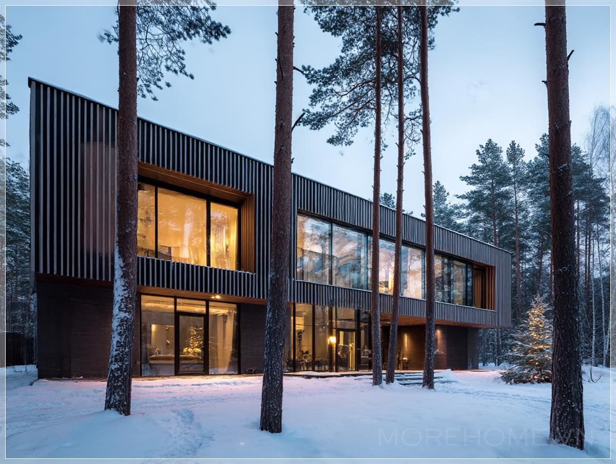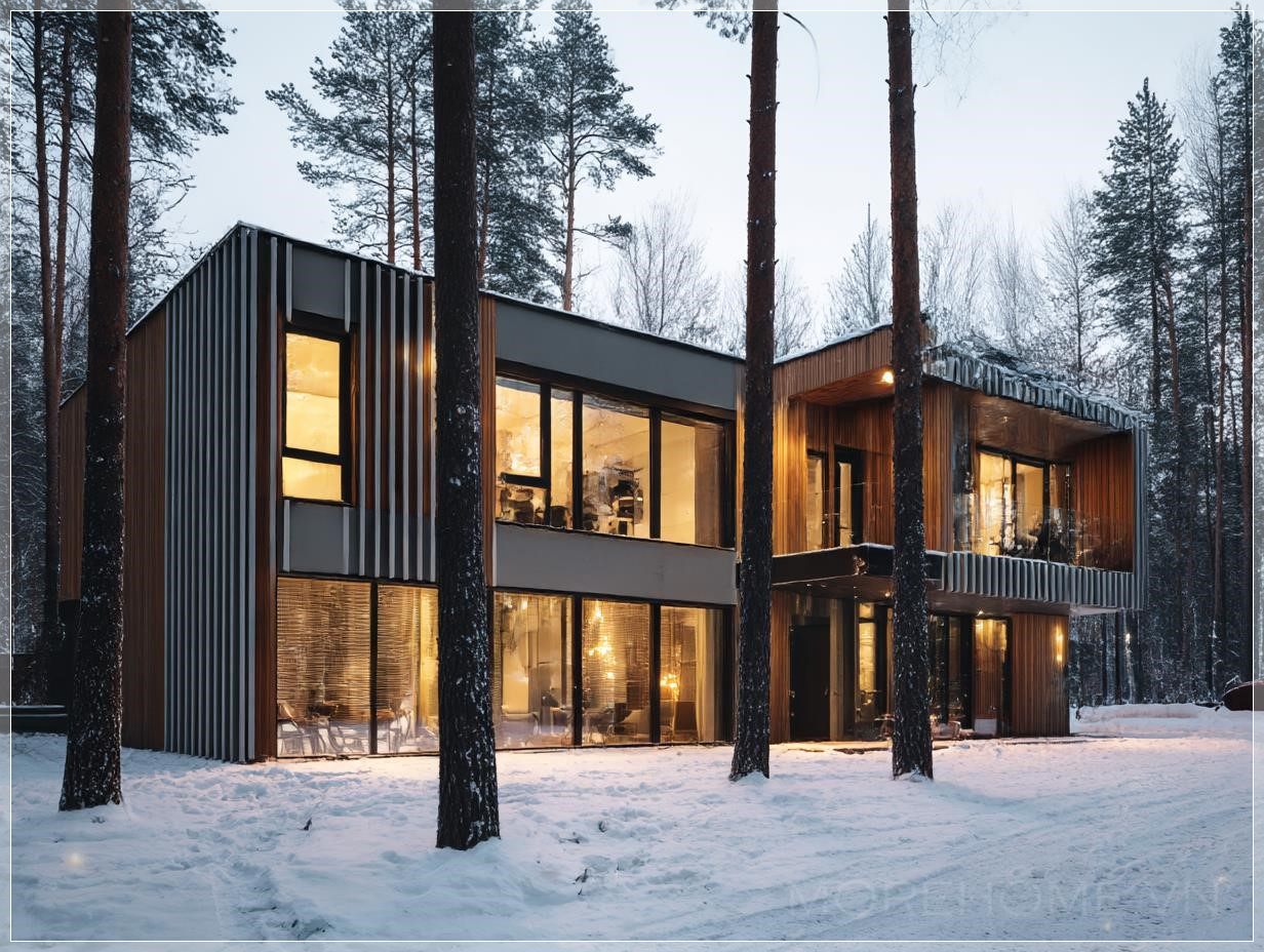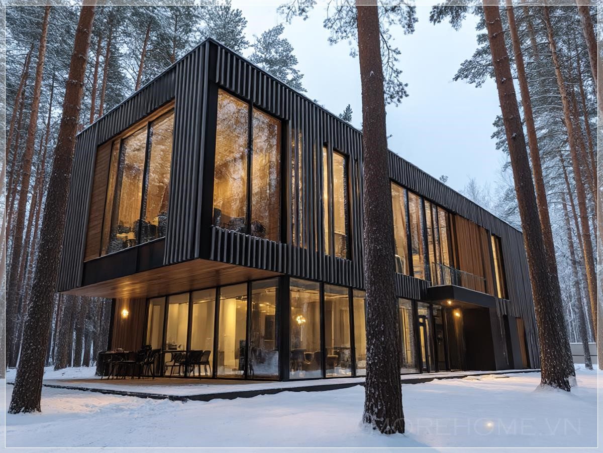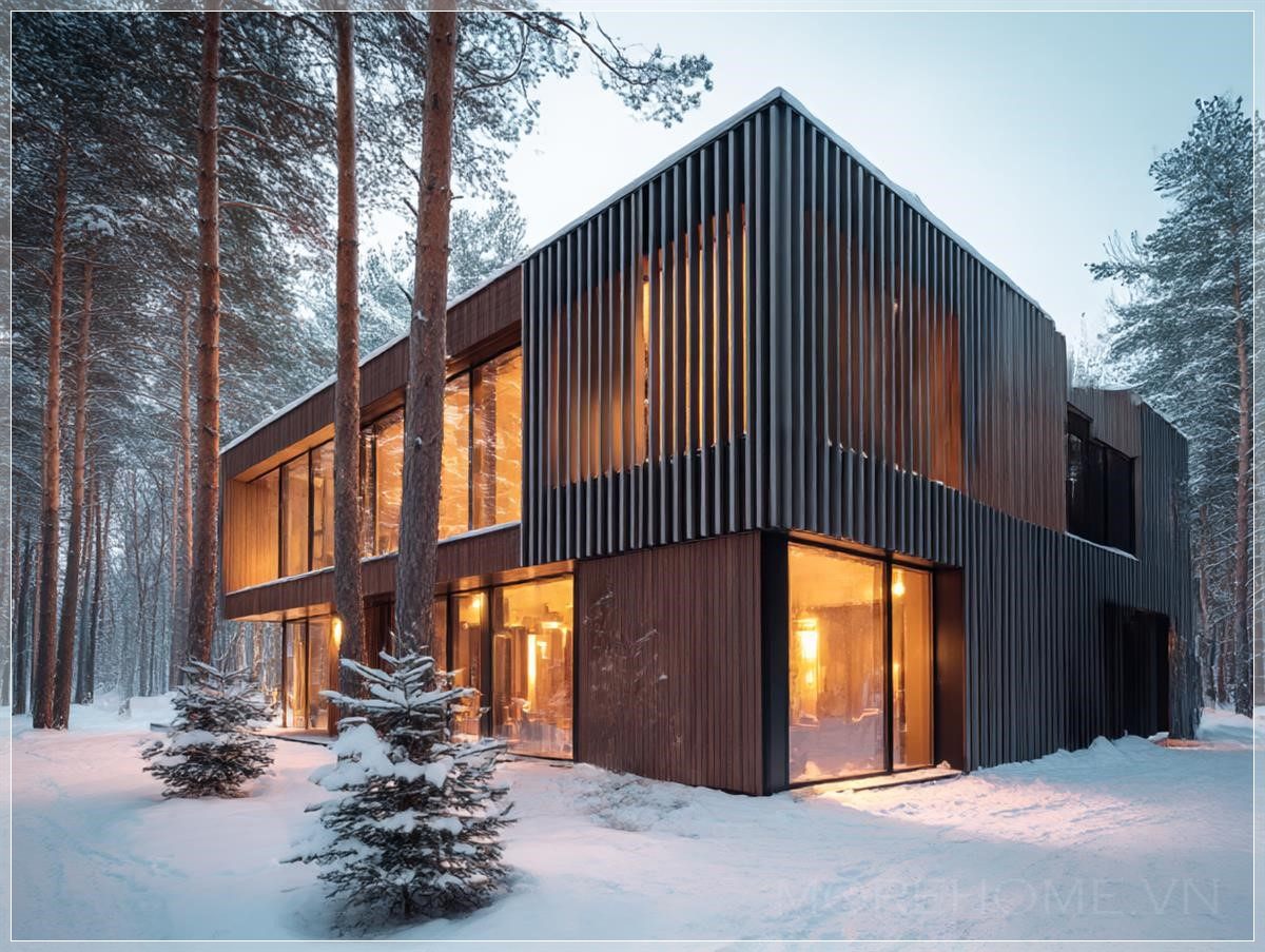 Ẩn mình trong lòng rừng thông cao vút, ngôi nhà hai tầng với diện tích 300 mét vuông hiện lên như một viên ngọc kiến trúc giữa mùa đông giá lạnh. Tuyết phủ trắng xóa trên nền đất và những cành cây khẳng khiu, tạo nên khung cảnh tĩnh lặng và trầm mặc. Giữa không gian ấy, công trình hiện đại nổi bật với mặt tiền phủ gỗ tự nhiên, mang sắc nâu trầm ấm áp tương phản đầy nghệ thuật với nền tuyết trắng xóa xung quanh.
