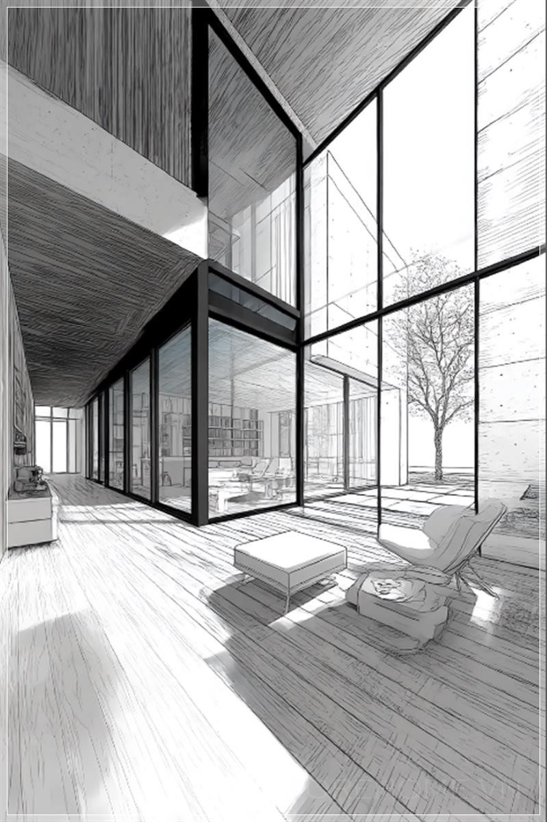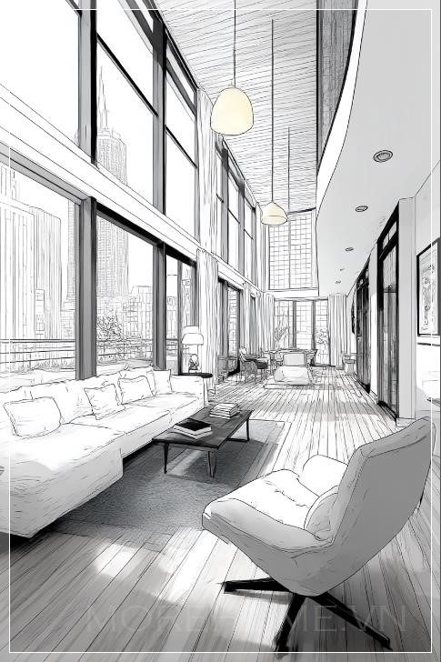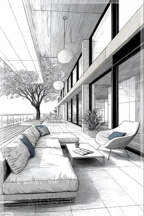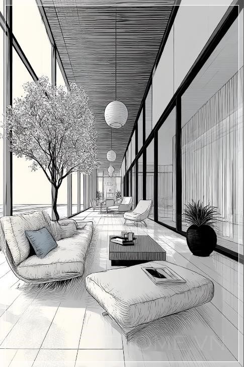 Hình ảnh sân thượng của một biệt thự hiện đại, nơi ánh sáng tự nhiên chiếu qua những cửa sổ lớn, mang đến một không gian thoáng đãng, dễ chịu. Cảnh vật xung quanh được thể hiện qua những đường nét đơn giản, với một phác thảo bằng nét vẽ tay sắc sảo, tạo nên một sự tinh tế trong thiết kế. Những đường kẻ đen trắng, thanh thoát của căn phòng mở rộng không gian sống, làm nổi bật sự kết hợp giữa kiến trúc hiện đại và sự sang trọng tự nhiên.