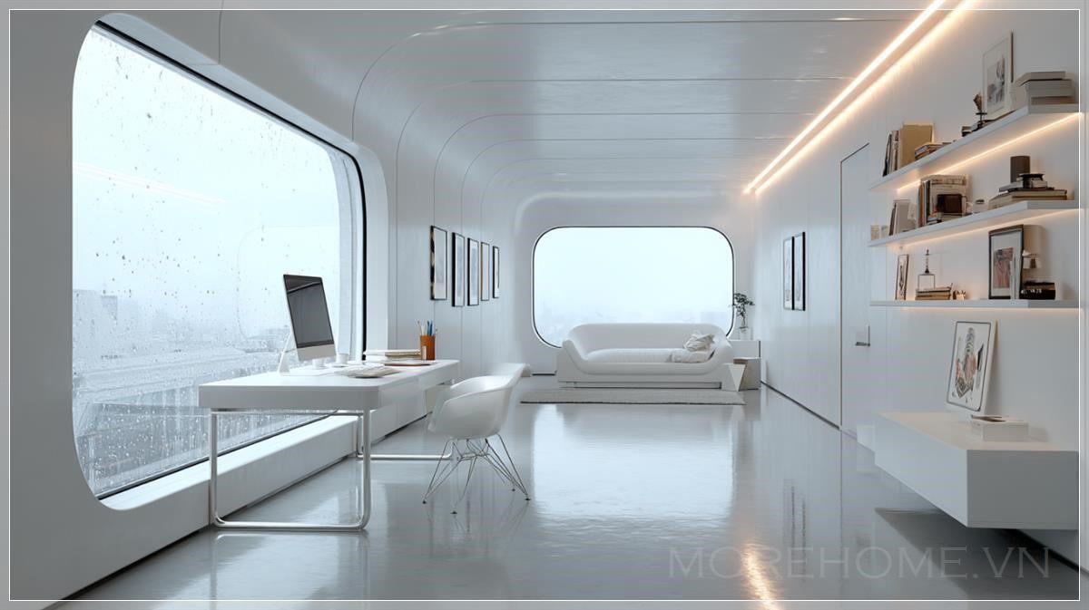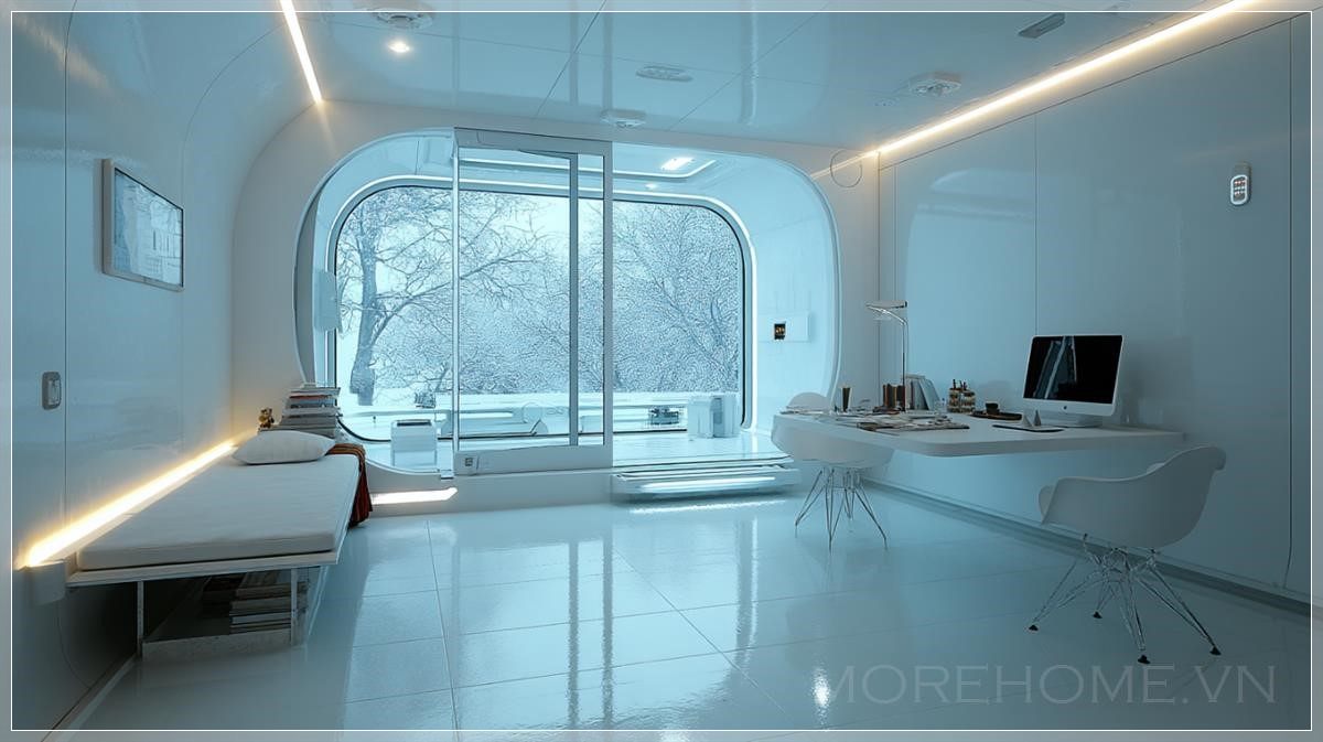 Phòng khám được bao quanh bởi một cửa sổ kính lớn, nhìn ra không gian vô tận. Ánh sáng mờ ảo từ các ngôi sao xa xôi chiếu qua, tạo nên một không gian thanh tịnh và yên bình, thích hợp để chữa lành cả thể chất lẫn tinh thần. Mọi vật dụng trong phòng đều mang sắc trắng thuần khiết, từ những bức tường mượt mà đến chiếc bàn làm việc đơn giản, nhẹ nhàng. Đèn LED trắng không chỉ chiếu sáng mà còn tạo ra một bầu không khí thanh thoát, nâng cao cảm giác hiện đại và không gian mở.
