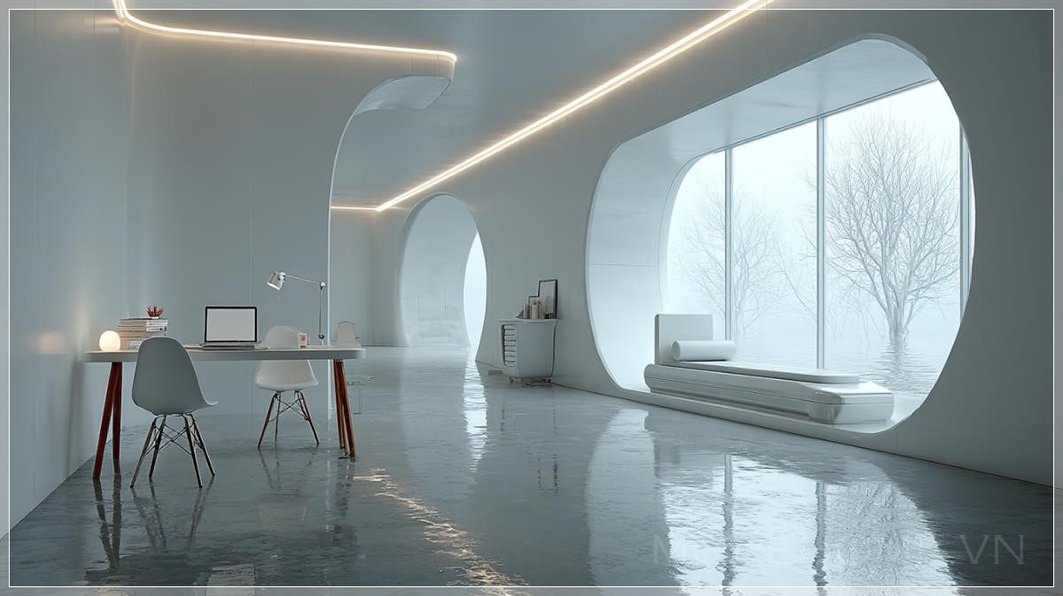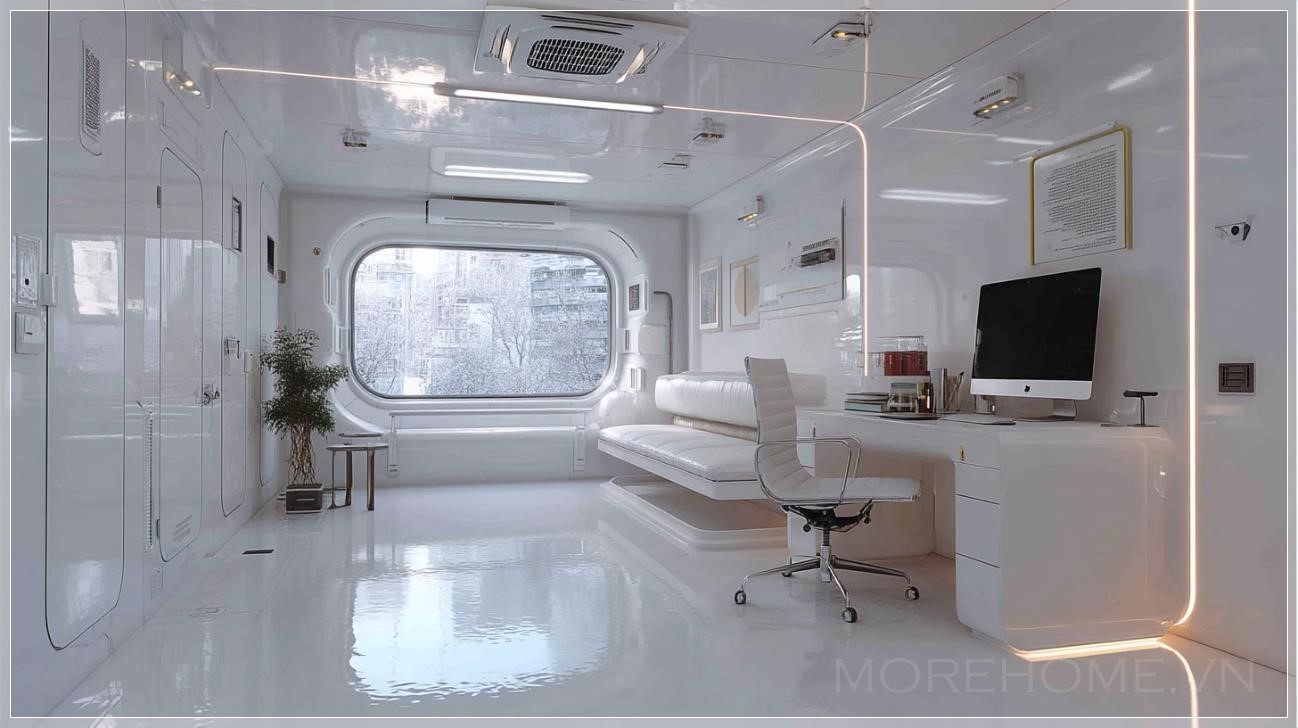 Hãy tưởng tượng một không gian hoàn toàn khác biệt, nơi khoa học và công nghệ hiện đại hòa quyện vào nhau. Một phòng khám bác sĩ nằm lơ lửng trong vũ trụ, với bức tường trắng tinh khiết, bàn làm việc tối giản, và hệ thống đèn LED trắng sáng tinh tế. Đây là không gian mà mọi chi tiết đều được tính toán để tạo ra một môi trường vừa sạch sẽ, vừa sang trọng, phản ánh sự tiến bộ không ngừng của y học và công nghệ.