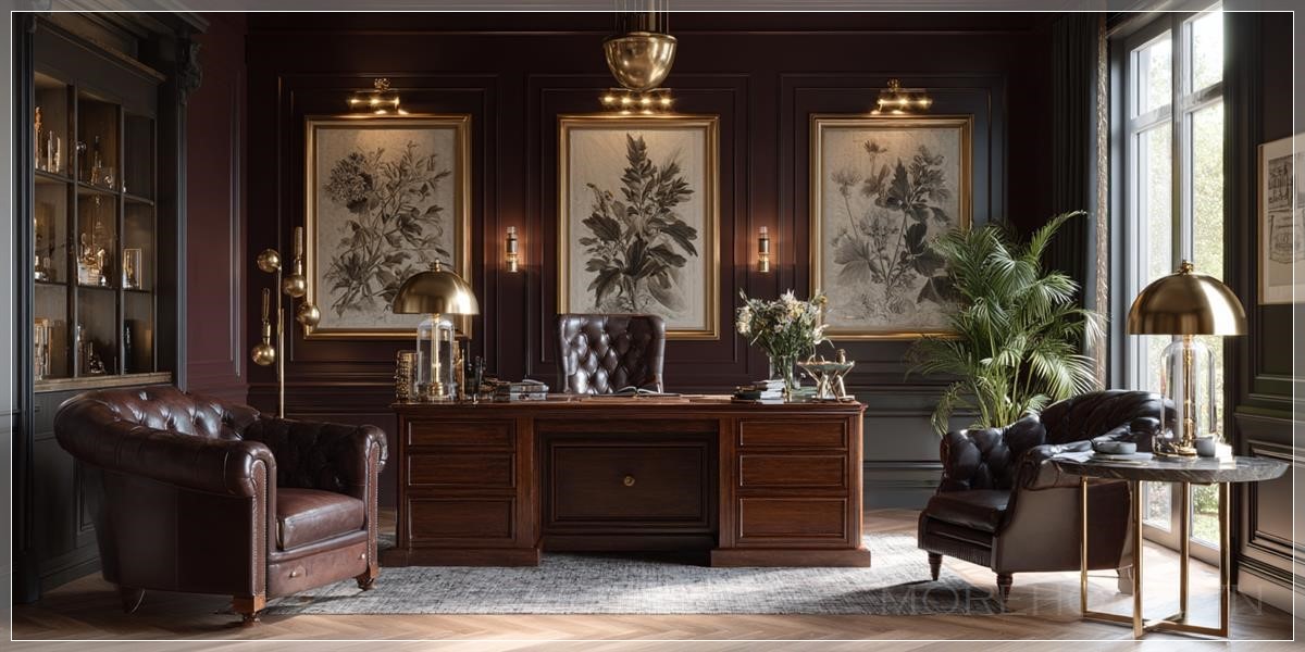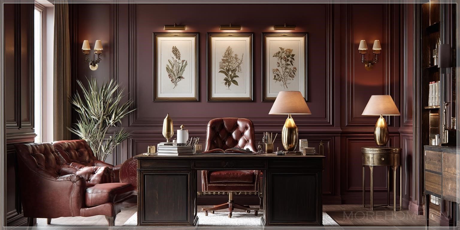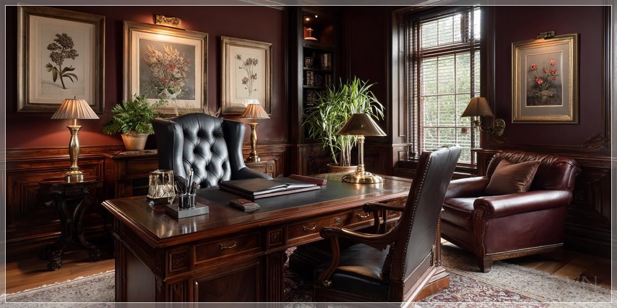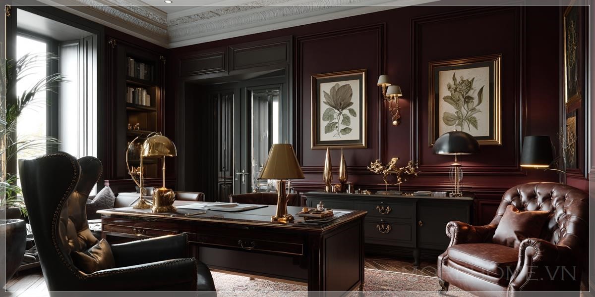 Màu burgundy đậm của các bức tường kết hợp với ốp gỗ tạo nên một không gian vừa ấm cúng vừa trang nghiêm. Sự lựa chọn màu sắc này không chỉ mang tính thẩm mỹ cao mà còn có tác dụng tâm lý, giúp tăng cường khả năng tập trung và suy nghĩ sâu sắc. Ốp gỗ không chỉ là yếu tố trang trí mà còn mang lại cảm giác ấm áp và gần gũi với thiên nhiên.