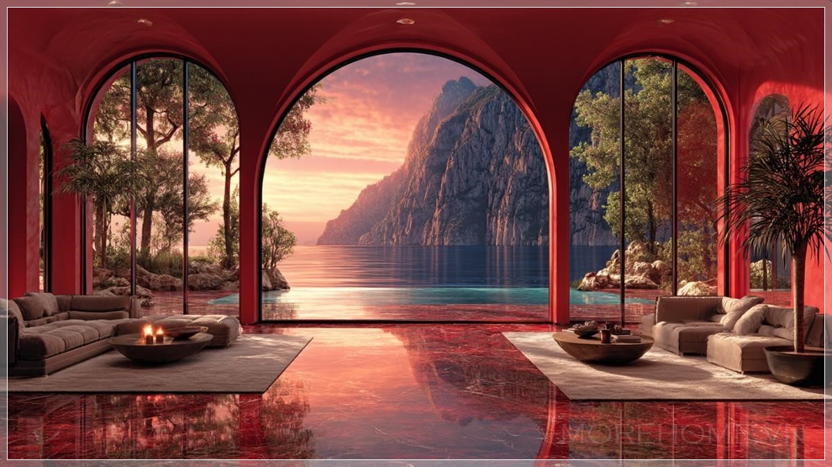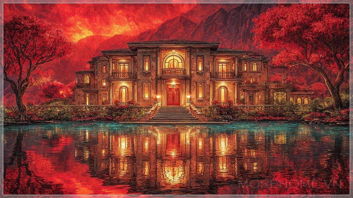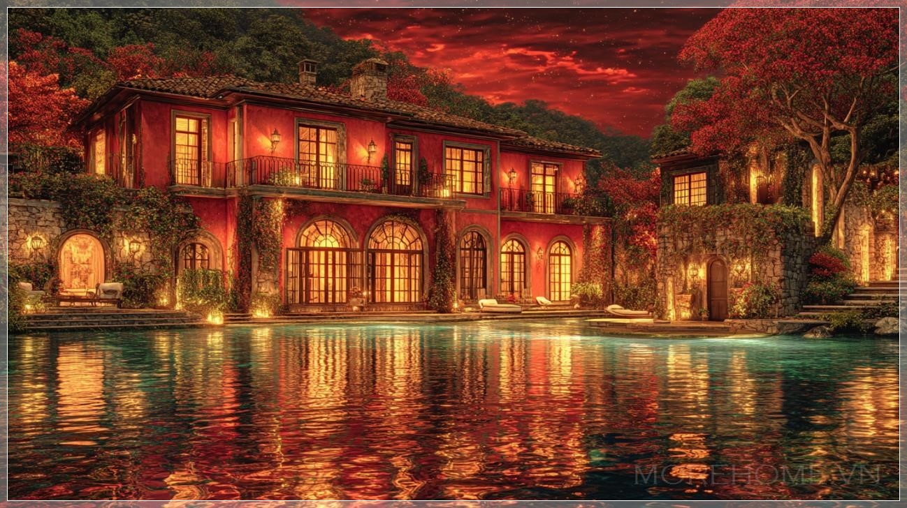 Khi màn đêm buông xuống và ánh sáng cuối cùng của hoàng hôn tan biến khỏi đường chân trời, villa bên hồ này trở thành một thánh địa của sự sang trọng và yên bình. Qua khung cửa sổ rộng lớn, thế giới bên ngoài như được phủ một lớp màu đỏ sẫm bí ẩn, tạo nên một khung cảnh vừa ấm áp vừa đầy mê hoặc.