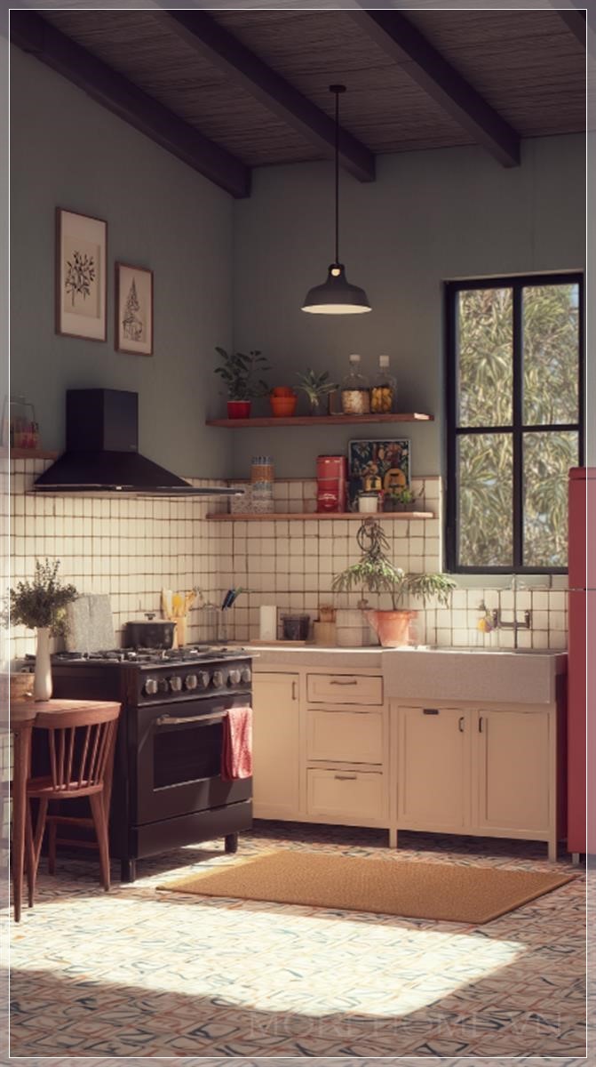 Sàn nhà được lát gạch ceramic vân gỗ, vừa dễ vệ sinh vừa tạo cảm giác ấm cúng như sàn gỗ tự nhiên. Những tấm thảm nhỏ với họa tiết vintage được đặt ở các vị trí chiến lược, không chỉ bảo vệ sàn nhà mà còn tăng thêm yếu tố thẩm mỹ và cá tính cho không gian.