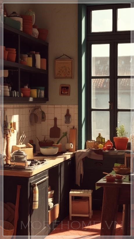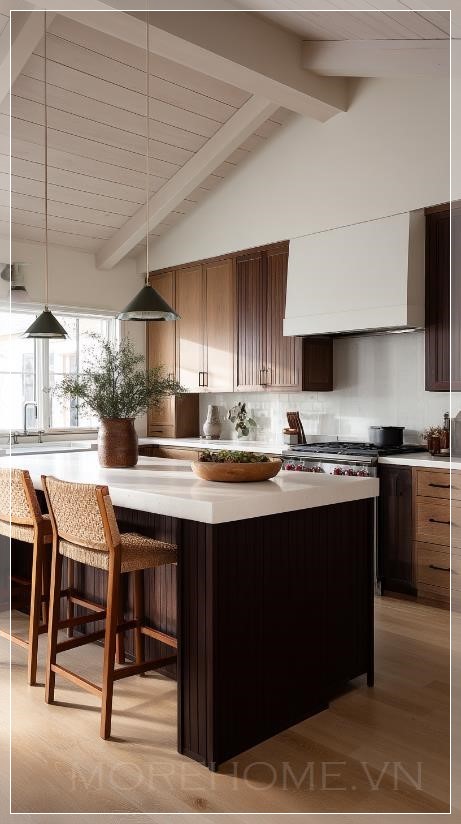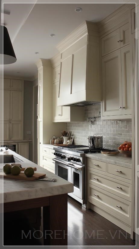 Ánh sáng tự nhiên len lỏi qua cửa sổ lớn, tạo nên những dải sáng vàng óng trải dài trên mặt bàn đá marble trắng tinh khôi. Những chiếc tủ bếp gỗ tự nhiên được thiết kế tinh tế, với đường nét mềm mại và màu sắc ấm áp, tạo cảm giác gần gũi và thân thiện. Mỗi ngăn tủ đều được sắp xếp khoa học, từ những chiếc chén bát sứ trắng tinh khiết đến các loại gia vị được đựng trong những hũ thủy tinh trong suốt.