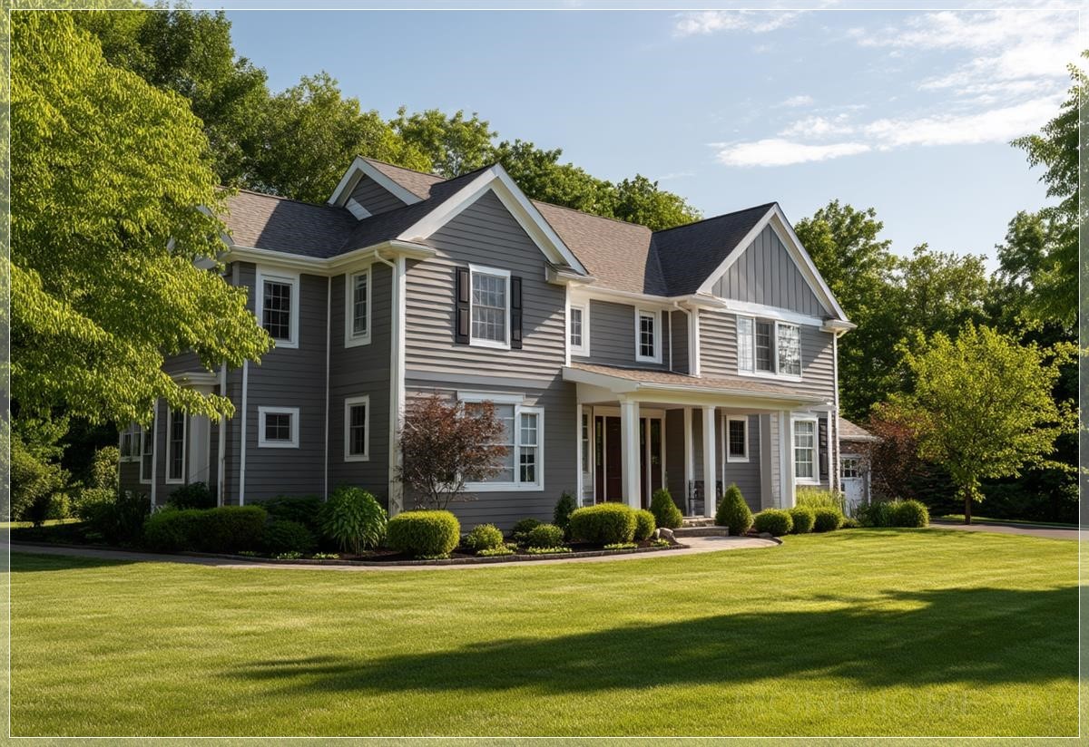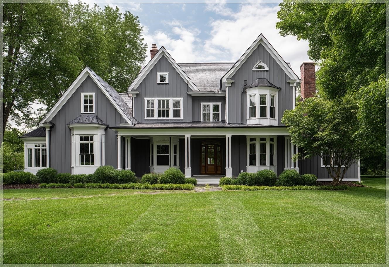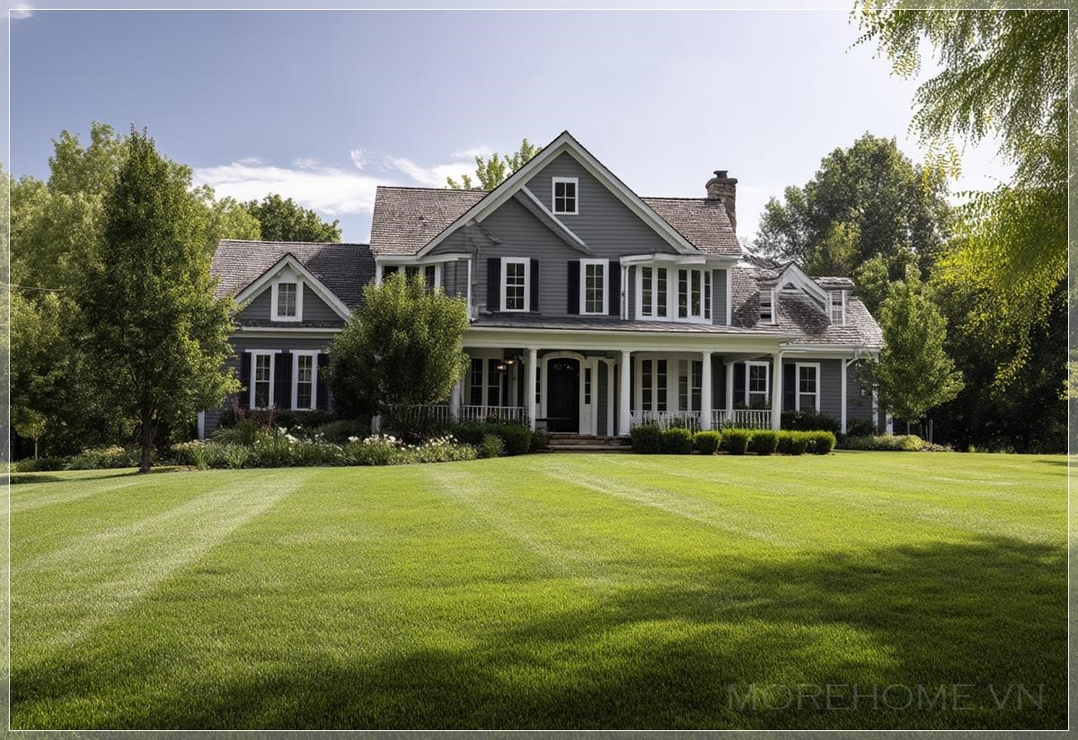 Trong không gian rộng mở của một khu phố yên tĩnh, ngôi nhà màu xám với những đường viền trắng tinh tế hiện lên như một tác phẩm nghệ thuật kiến trúc hoàn hảo. Đây không chỉ đơn thuần là một ngôi nhà, mà là hiện thân của giấc mơ Mỹ - nơi mà sự thanh lịch và tiện nghi hòa quyện trong từng chi tiết.