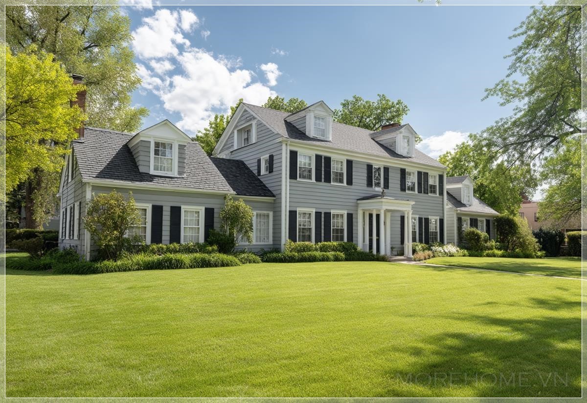 Phong cách kiến trúc Mỹ truyền thống được thể hiện rõ nét qua từng chi tiết - từ mái nhà với độ dốc vừa phải, những cửa sổ được bố trí cân đối, cho đến lối vào chính được thiết kế gọn gàng nhưng không kém phần ấn tượng. Những đường nét sạch sẽ và rõ ràng của ngôi nhà tạo nên một hình ảnh mạnh mẽ và đáng tin cậy, phản ánh đúng tinh thần của kiến trúc nhà ở Mỹ - đó là sự kết hợp giữa tính thực dụng và thẩm mỹ.