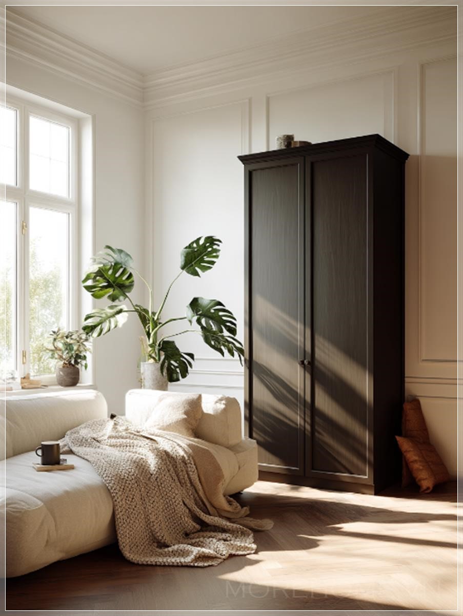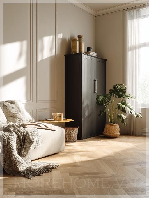 Chiếc tủ lưu trữ màu nâu đậm đứng khiêm tốn trong góc phòng, với những đường nét tinh tế và tay cầm đơn giản, như một người bạn thầm lặng giữ gìn những kỷ niệm quý giá. Bề mặt matted của nó phản chiếu ánh sáng một cách dịu dàng, không gây chói lóa mà tạo nên chiều sâu ấm áp cho không gian.