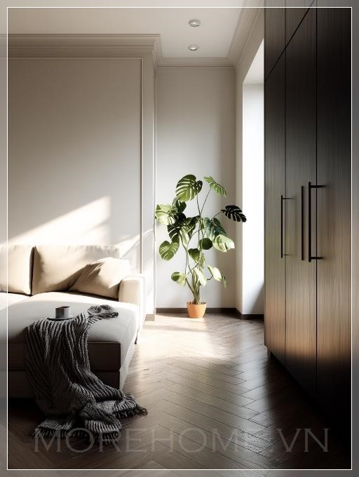 Ánh nắng nhẹ nhàng phản chiếu trên sàn gỗ, tạo nên những vệt sáng ấm áp xen lẫn với bóng râm mềm mại. Chính sự tương tác này giữa ánh sáng và bóng tối đã thổi hồn vào không gian, khiến nó sống động và có chiều sậm. Không gian không còn là nơi ở đơn thuần mà trở thành một tác phẩm nghệ thuật được viết bằng ánh sáng.