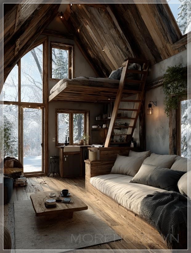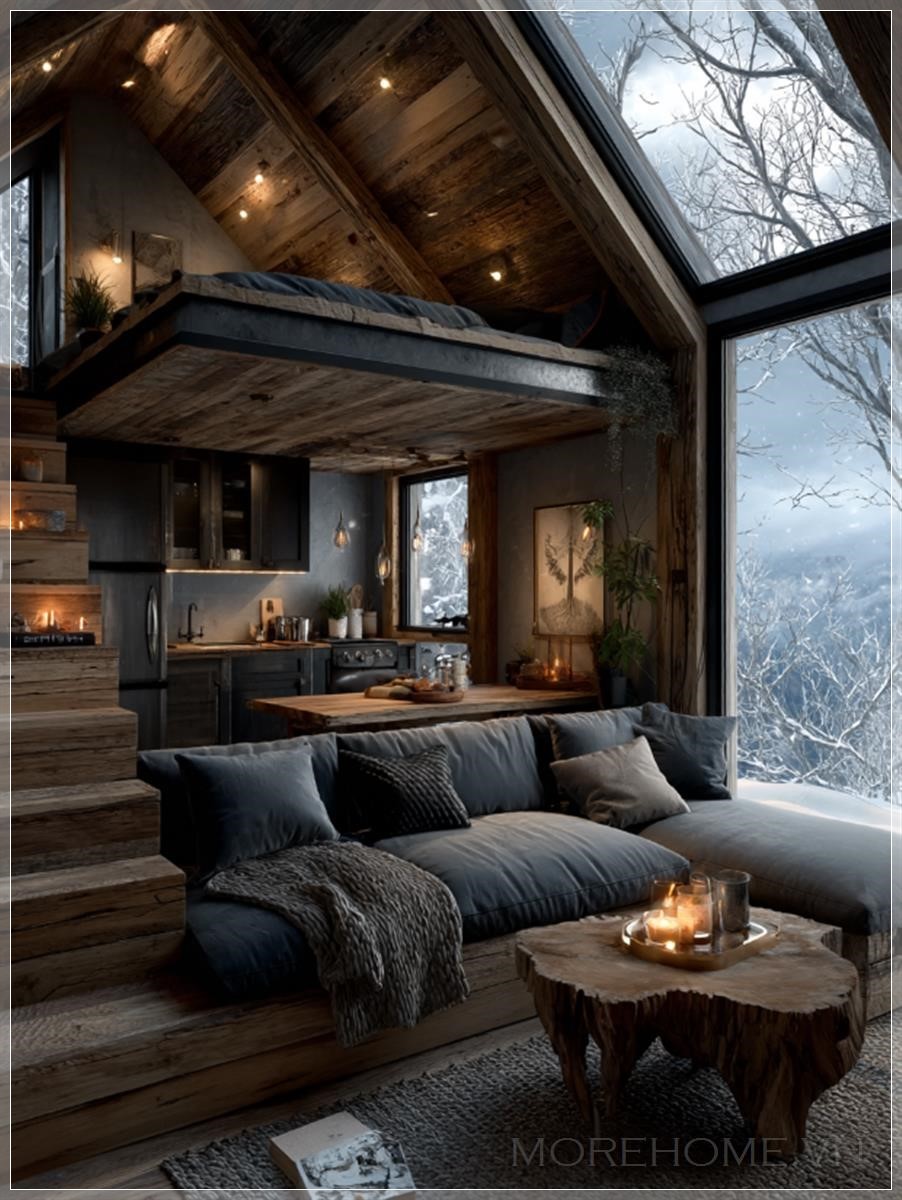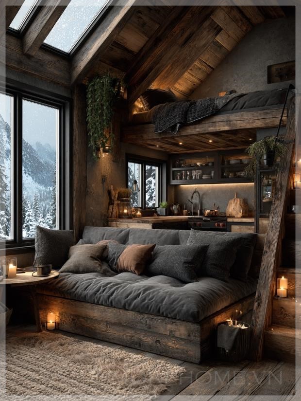 Ở tầng trên, chiếc giường loft dễ dàng tiếp cận thông qua một cầu thang gỗ nhỏ gọn, mang lại sự tiện lợi cho không gian vừa đủ. Mặc dù ngôi nhà có kích thước nhỏ, nhưng sự bố trí thông minh và sự kết hợp giữa các chi tiết nội thất đã biến nó thành một nơi nghỉ ngơi lý tưởng. Ánh sáng êm dịu từ các đèn LED dọc theo các góc tường tạo ra một bầu không khí dễ chịu, phù hợp để thư giãn sau một ngày dài.