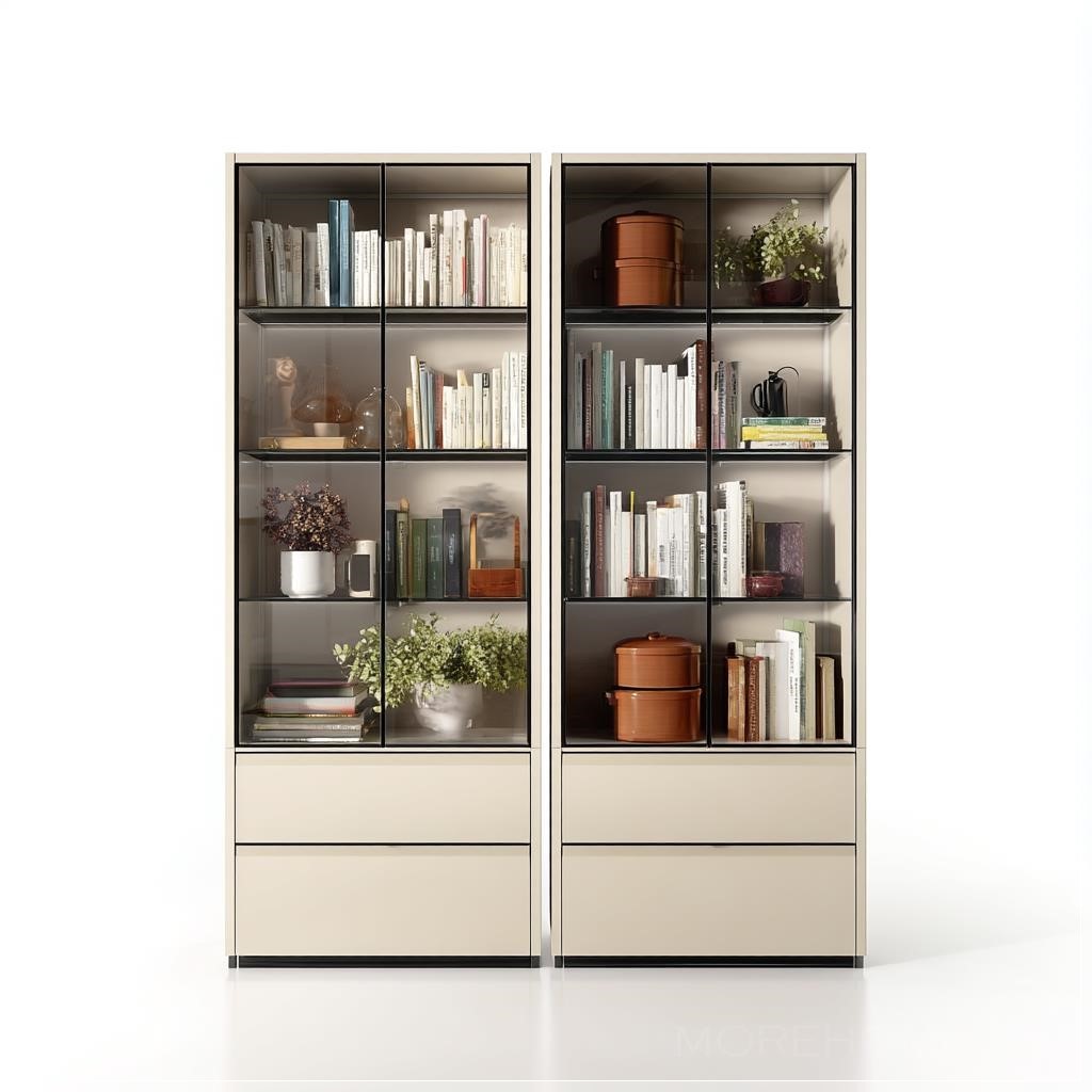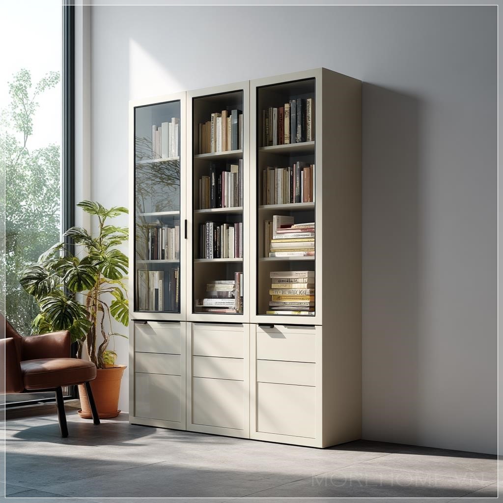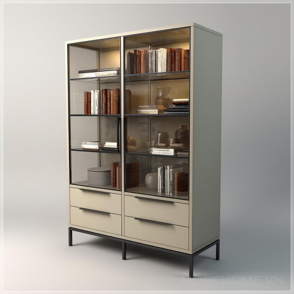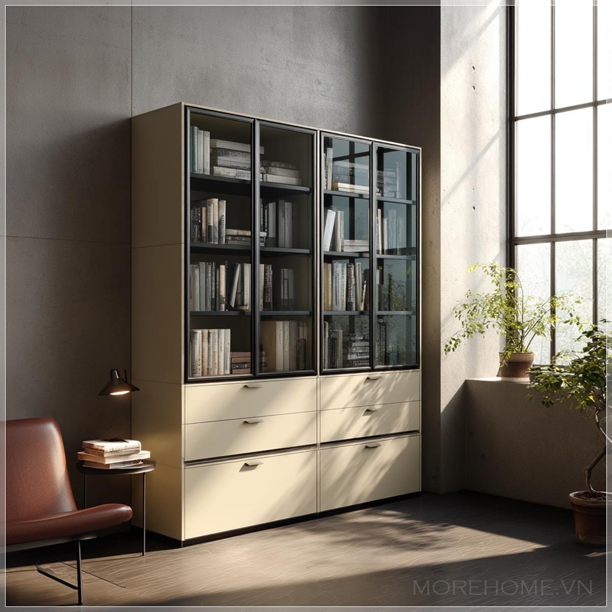 Phần trên của tủ được trang bị bốn kệ sách, mỗi kệ đều có cửa kính dày, được làm từ kính stopsol với khung nhôm đen. Những chiếc cửa kính này không chỉ bảo vệ đồ vật bên trong khỏi bụi bẩn mà còn mang lại một vẻ ngoài sang trọng và tinh tế. Khung nhôm mỏng tạo nên sự thanh thoát, không làm mất đi vẻ đẹp tổng thể của tủ. Kệ sách có thể dùng để trưng bày sách vở, vật trang trí hoặc các vật dụng cá nhân, dễ dàng thay đổi theo nhu cầu sử dụng.