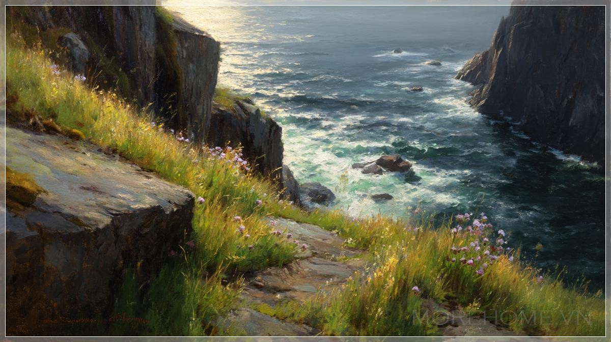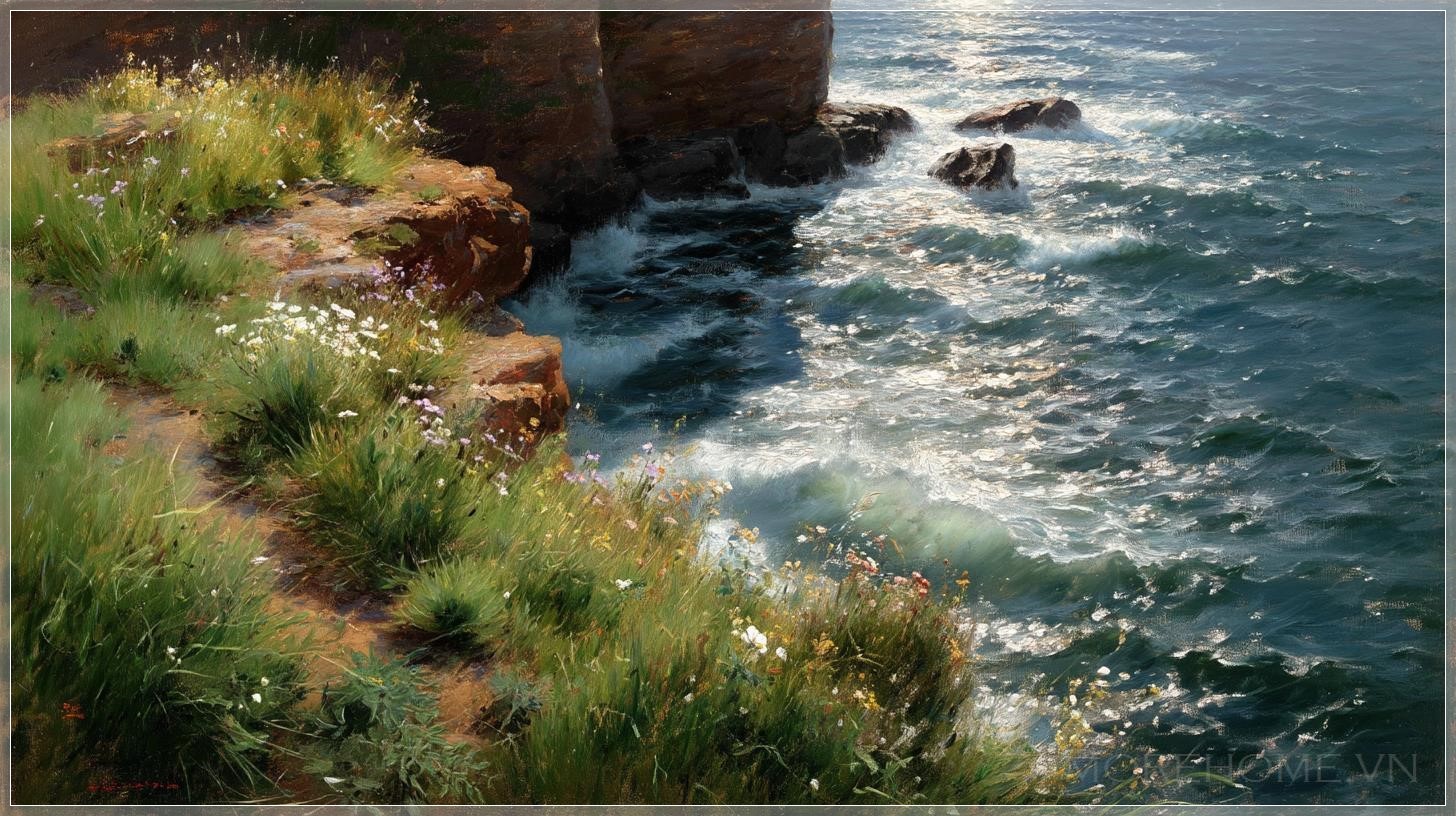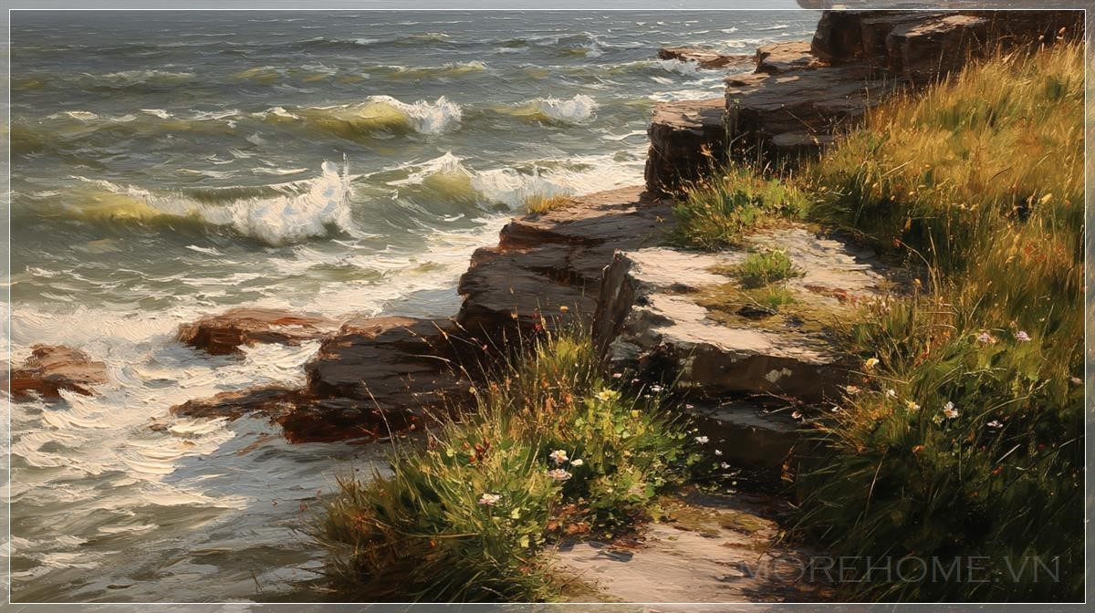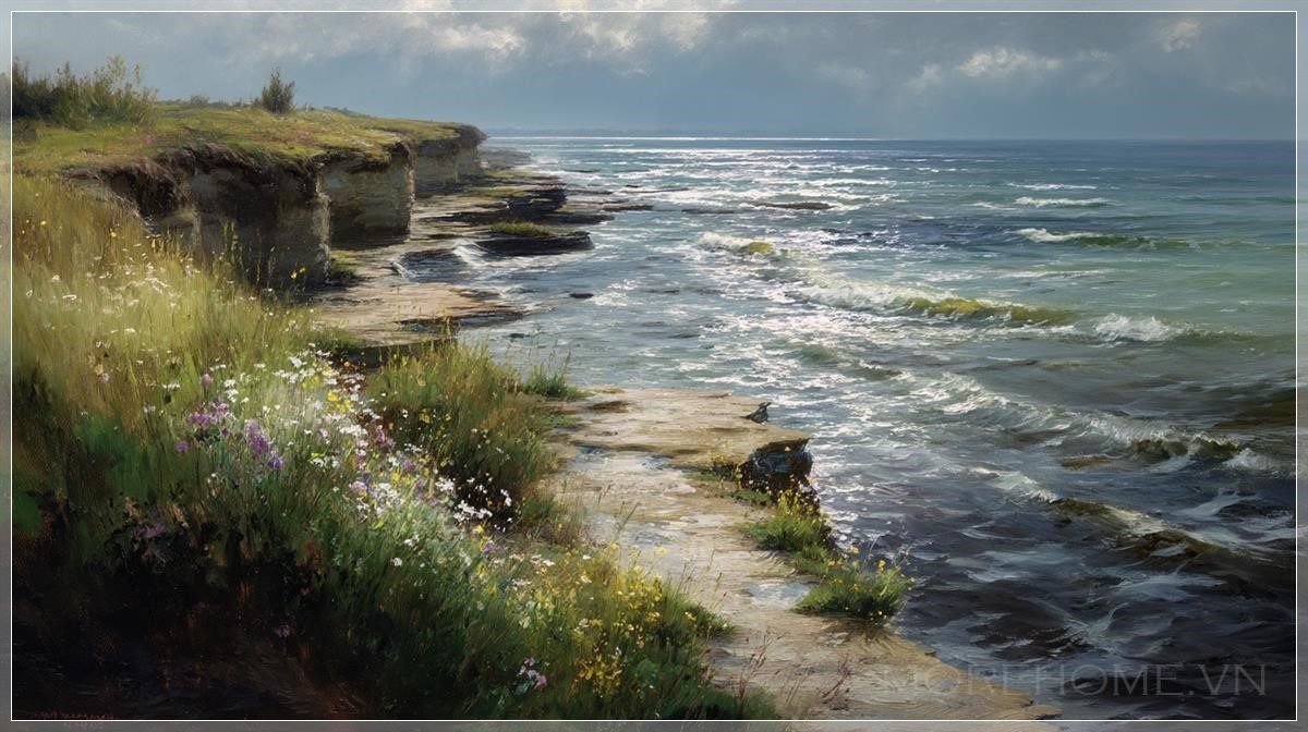 Được biết đến là một trong những họa sĩ thiên nhiên xuất sắc, Peder Mork Monsted mang lại một phong cách rất đặc trưng với việc sử dụng ánh sáng mạnh mẽ và các chi tiết tự nhiên rất tỉ mỉ. Trong tác phẩm về khung cảnh đại dương này, ông thể hiện sự tương phản rõ rệt giữa bầu trời và mặt nước, giữa sóng vỗ và bờ đá, tất cả hòa quyện vào nhau, tạo ra một bức tranh vừa mạnh mẽ vừa tĩnh lặng. Những cánh hoa dại và cỏ xanh mọc bên mép vách đá không chỉ tạo nên nét đẹp sinh động mà còn làm tăng thêm sự sống trong một không gian rộng lớn và hùng vĩ như thế.