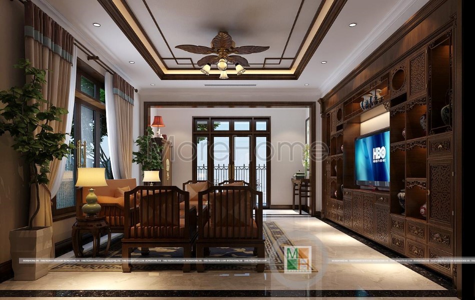 Đa số đồ nội thất đều được làm từ gỗ tự nhiên và bao bọc trên mình lớp màu cánh gián đặc trưng không thể lẫn đi đâu được. Nhìn vào phòng khách chúng ta có thể thấy rằng tất cả đồ nội thất gỗ kết hợp với gam màu trắng hoặc màu be để làm nổi bật được vẻ đẹp của gỗ, những tình tiết trang trí như đệm sofa hay thảm trải nhà lại sử dụng những gam màu cùng tông để dồn mọi sự chú ý vào nội thất gỗ.