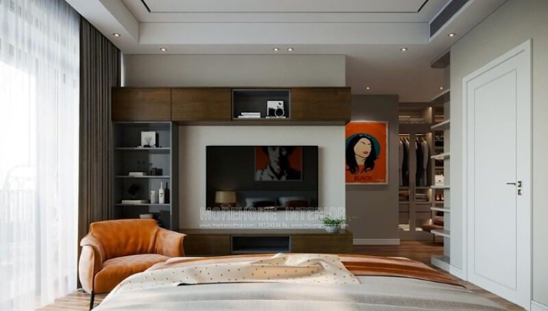 Sàn gỗ, bộ bàn ghế trang điểm, tủ quần áo, kệ tivi, cửa gỗ gỗ óc chó đã tạo nên vẻ đẹp sang trọng, độc đáo trong phong cách hiện đại tại phòng ngủ vợ chồng mặc dù với phong cách này đồ nội thất gỗ công nghiệp thường là lựa chọn phổ biến.