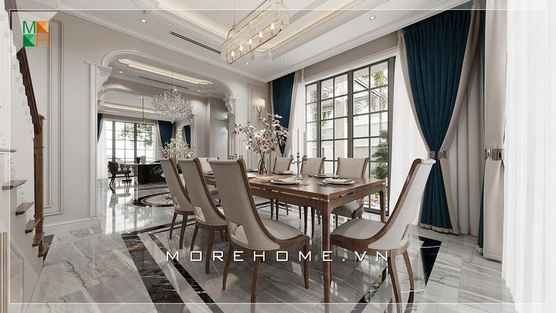 Bố trí phòng ăn liền phòng khách đẹp, sang trọng ấn tượng với sắc xanh nổi bật từ bộ bàn ghế cùng lối thiết kế nội thất tân cổ điển quý phái.